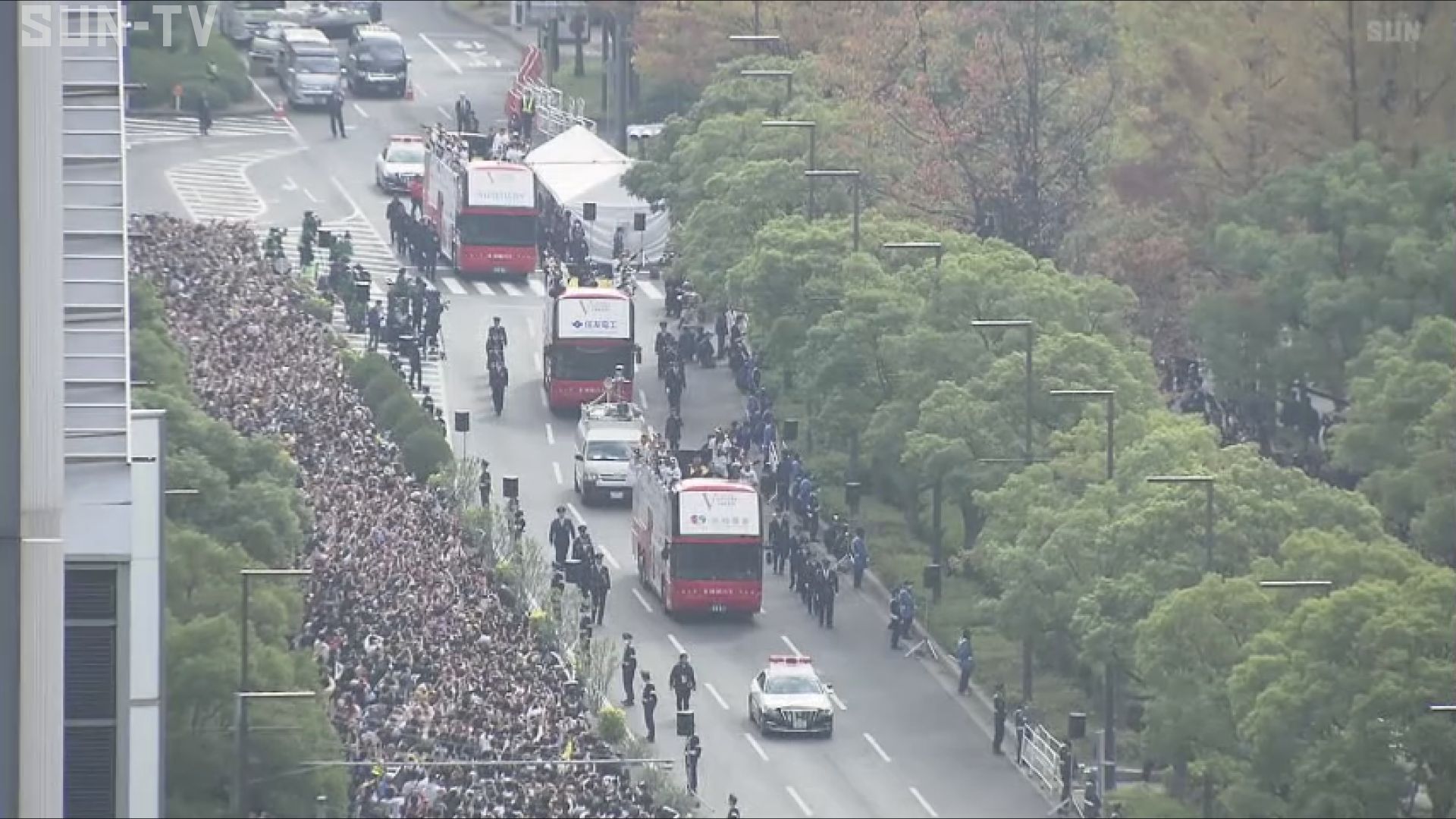 38年ぶりに日本一に輝いた阪神タイガースの優勝記念パレードは、午前11時に神戸・三宮の東遊園地前で開かれたセレモニーから始まりました。