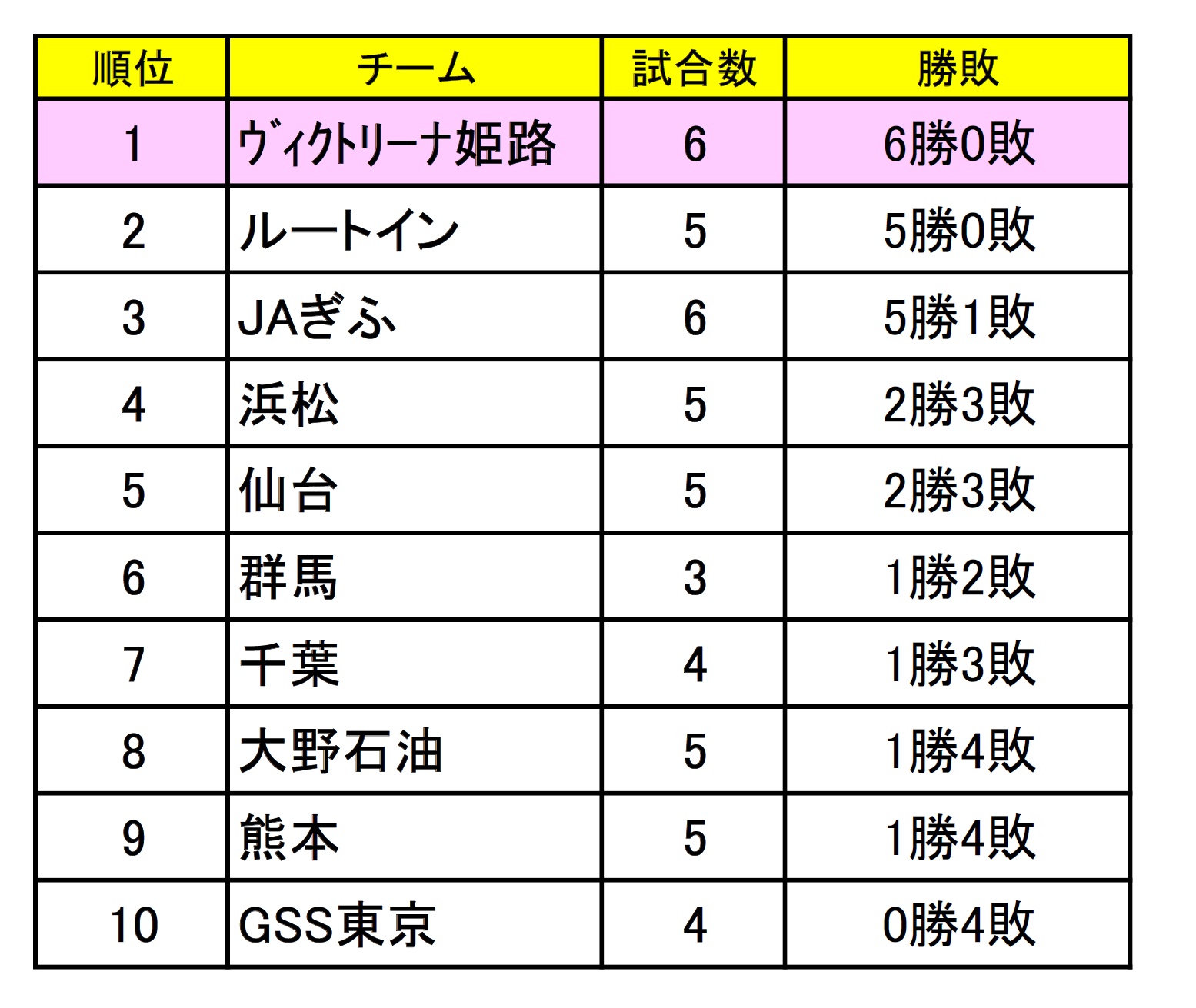 V2女子は、6勝0敗のヴィクトリーナ姫路が首位を走り、5勝0敗のルートインが2位につけている。
