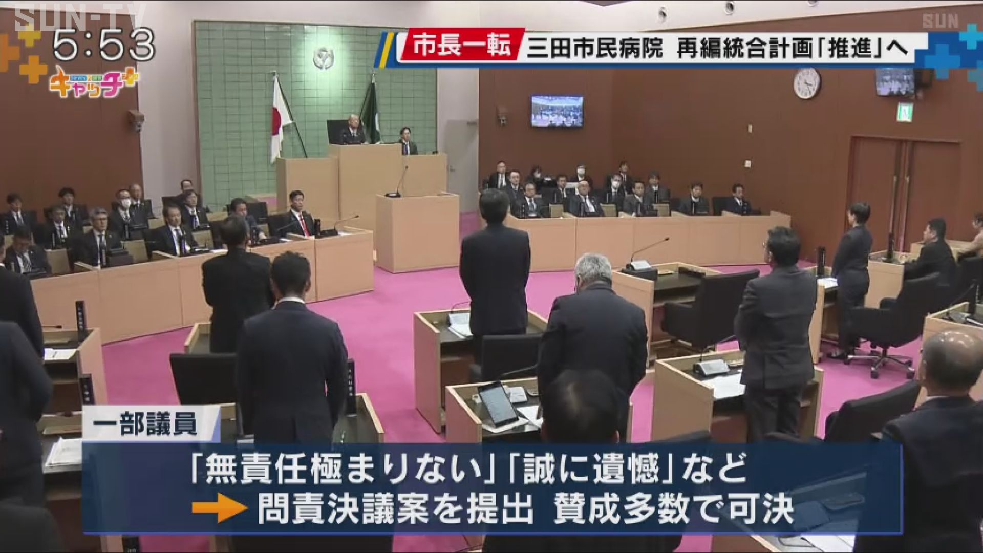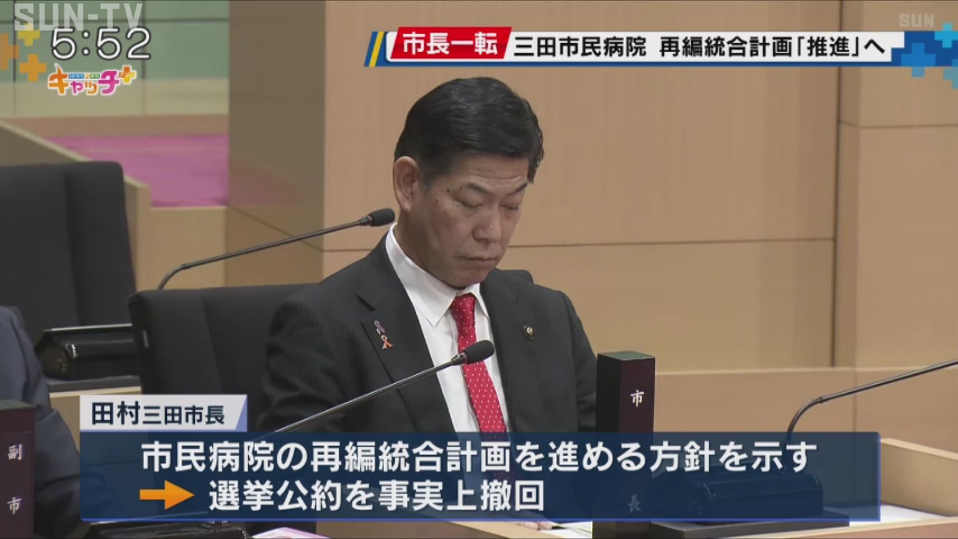 三田市民病院の再編統合計画を白紙撤回する公約を掲げて当選した田村市長がきょう開会した市議会の冒頭、一転して、計画を推進する方針を表明しました。
