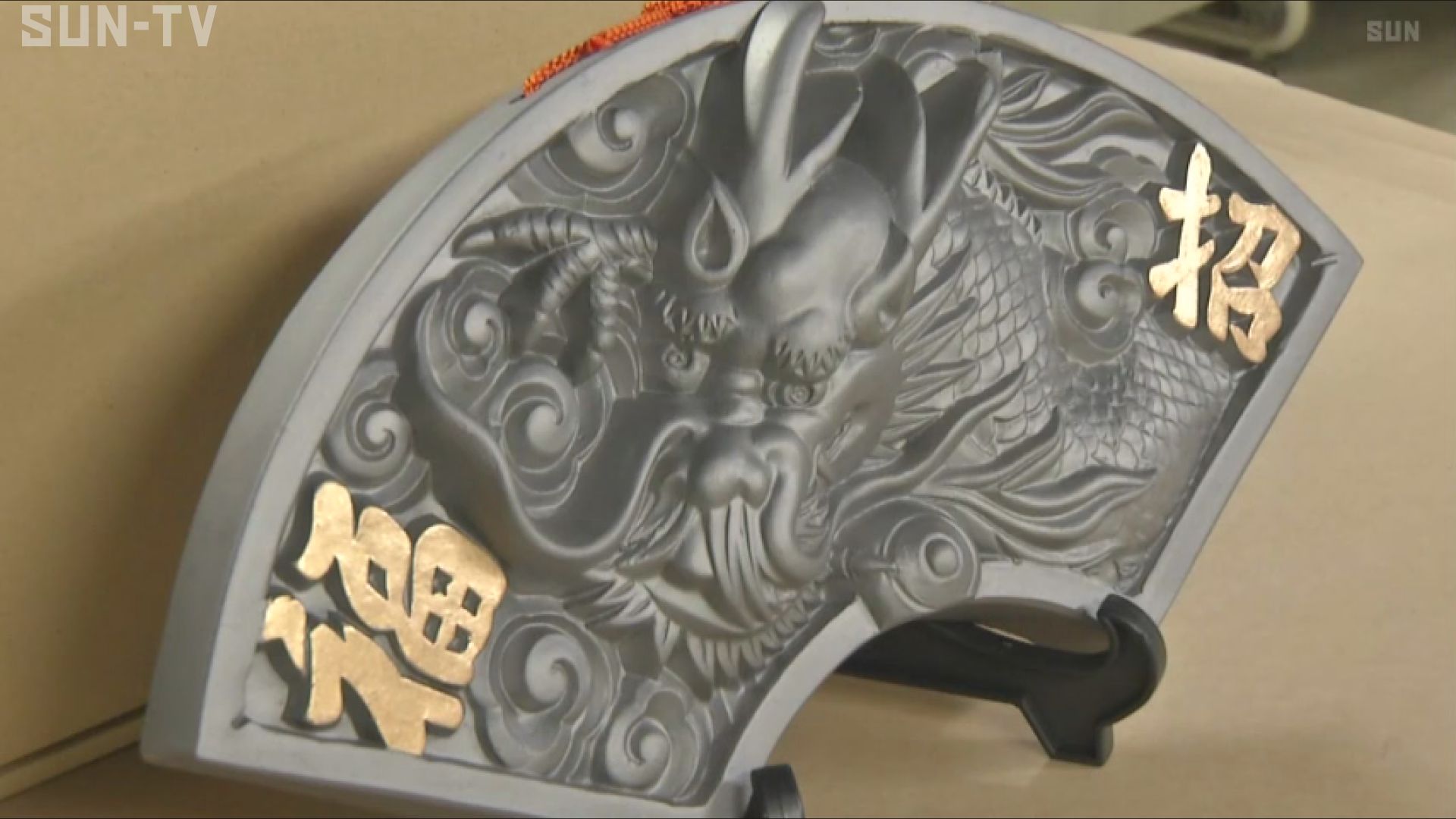 南あわじ市の新崎製瓦では、幅およそ40センチ高さ20センチほどの扇形の瓦に、勢いよく空を舞う「たつ」をデザイン。