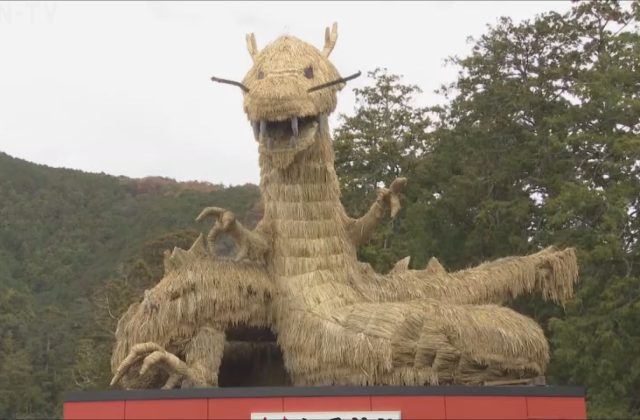 地元で取れた酒米の稲穂を大量に束ねて、およそ1カ月かけて作られたもので、高さ5メートル、横幅6メートル、長さ4メートルで、重さは2トンもあります。
