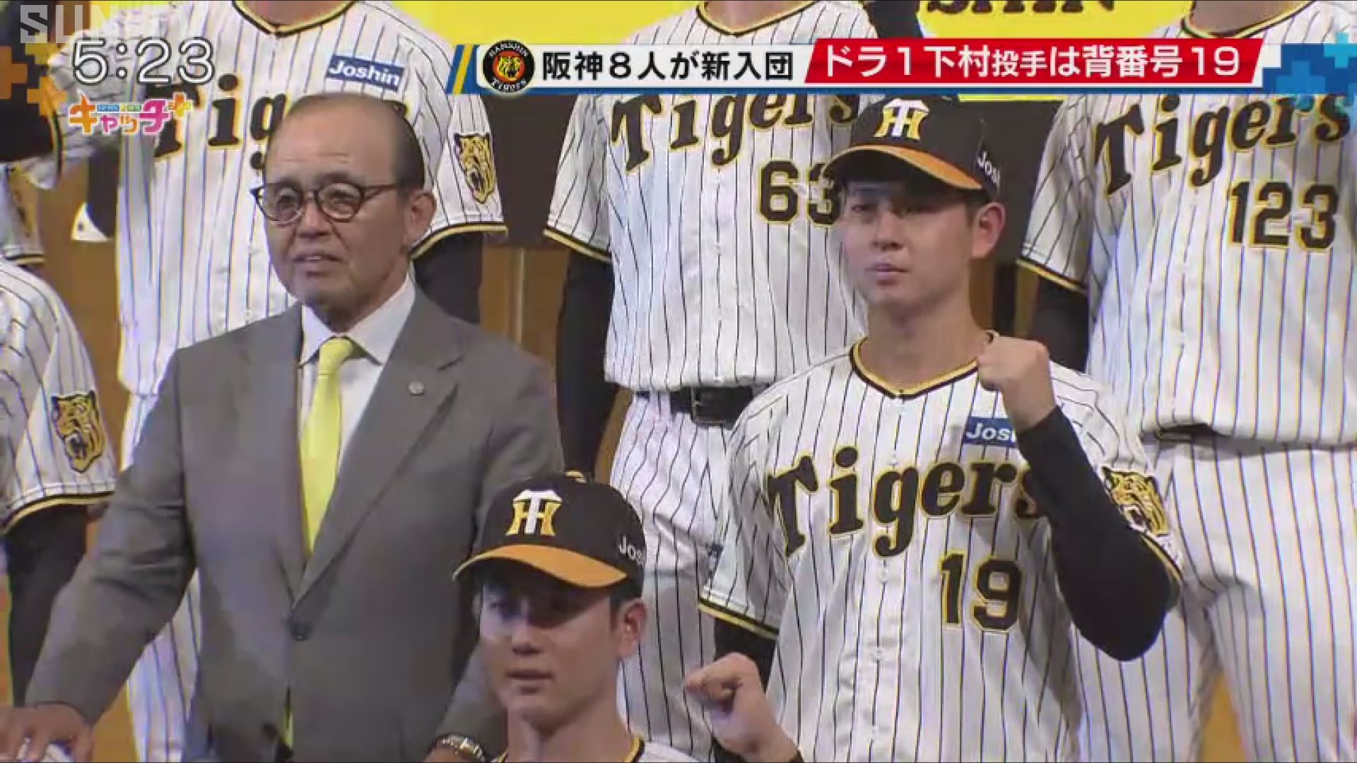 「偉大な先輩方がつけられてきた番号だと思うんですけど、いずれは「阪神の19番は下村」と言ってもらえるような選手を目指して頑張りたいと思います。兵庫県西宮市出身なので、プレーで西宮を盛り上げられるように精一杯頑張ります。よろしくお願いします」