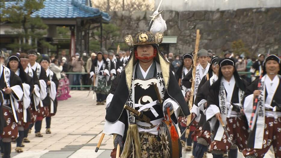 大石内蔵助に扮した俳優の中村雅俊さんが、討ち入りの太鼓を合図に四十七人の赤穂義士のパレードが始まります。
