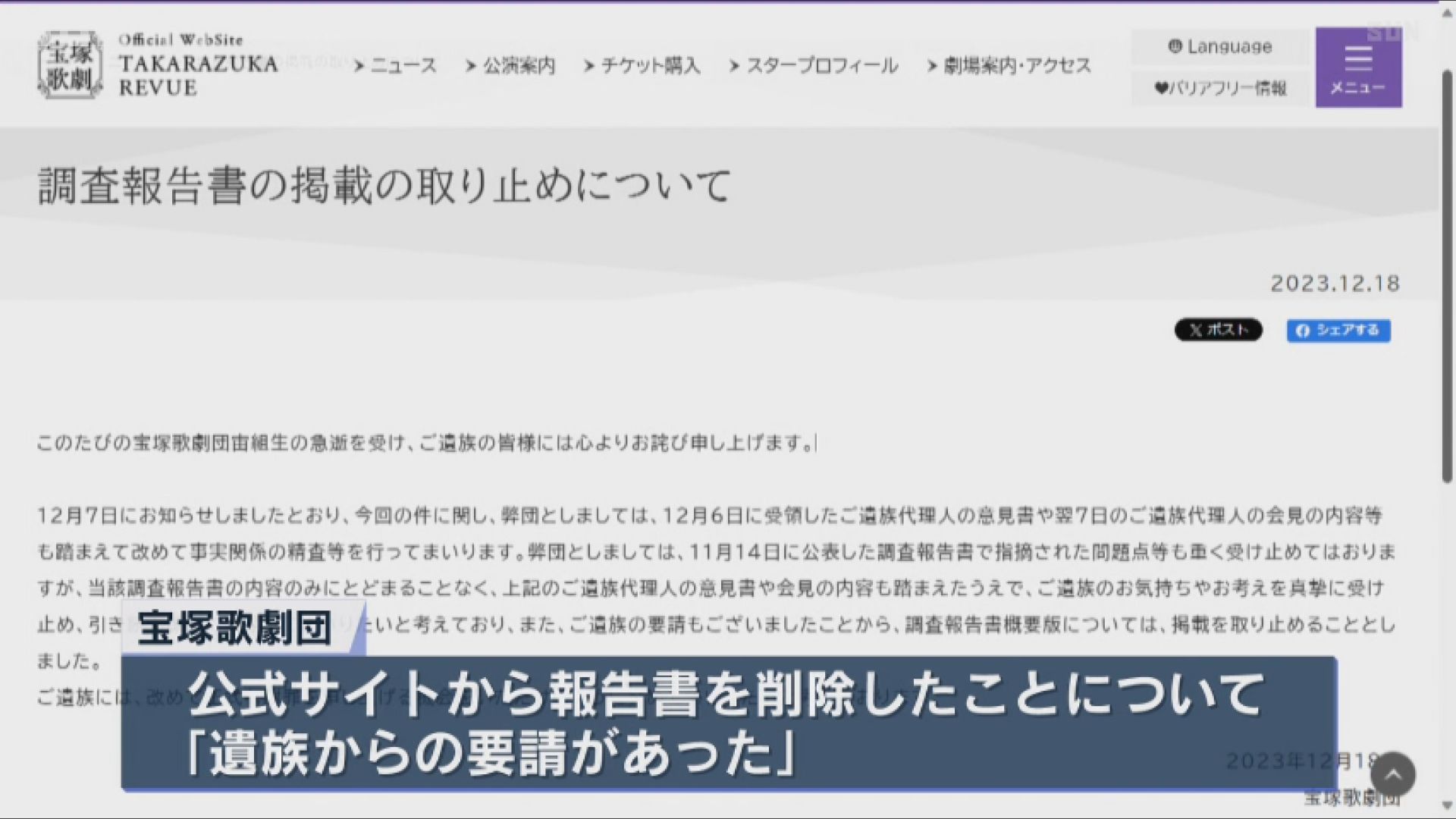 宝塚歌劇団の25歳の俳優の女性が急死した問題で、劇団は2023年11月に公表した調査報告書を12月18日、公式サイトから削除しました。