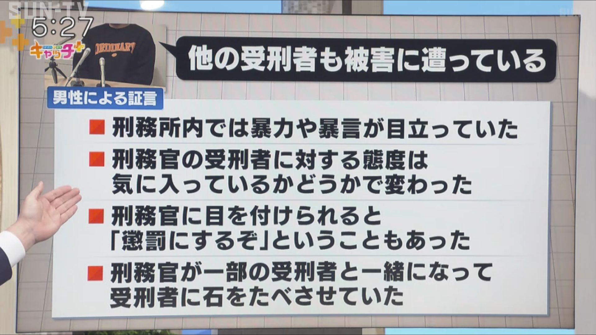 さらに、「最初はからかう感じで僕の名字を呼んで『死ね』から始まった。そのままエスカレートしていって、僕らが作業で使うリッパー(裁縫道具)で背中刺したり腕刺したりとかしてきて、血が出るぐらい刺されて、(男性刑務官に)『お前口開けろ』と言われて、何か疑われたのかと思ったんで口開けたんですけど、その時に刑務官が個人で使う消毒液をいきなり口に入れられて、『お前は顔も汚いから 口もきれいにしたろと思って』と笑いながら言っていて、僕は何も言えなくて悪いことをして(刑務所に)入ったのがそもそも間違いなんですけど、いち人間なので更生しようとみんな頑張っているので、その人たちをおもちゃのように扱うのは許せない」と訴えます。