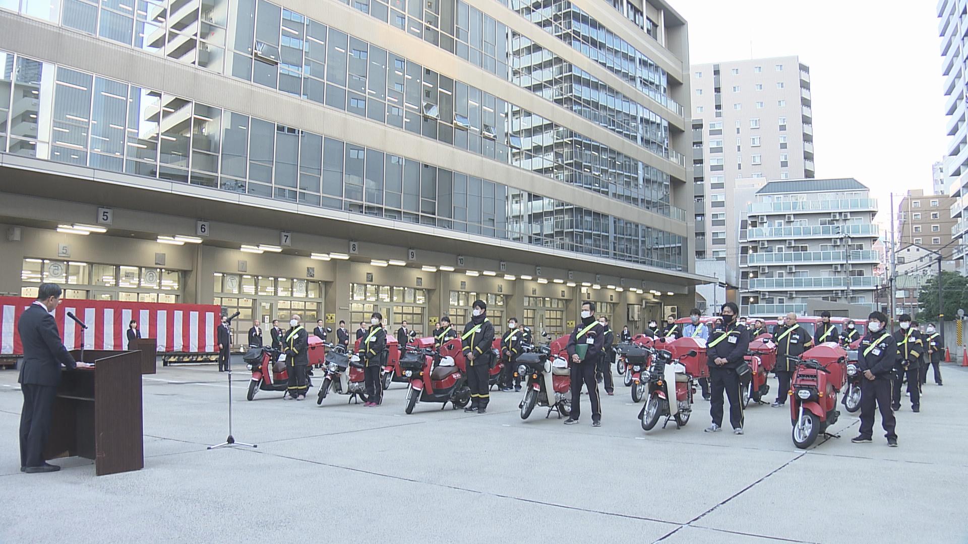 そのあと号令を合図に配達員たちは各家庭に年賀状を届けるためにバイクや車に乗り込み出発しました。