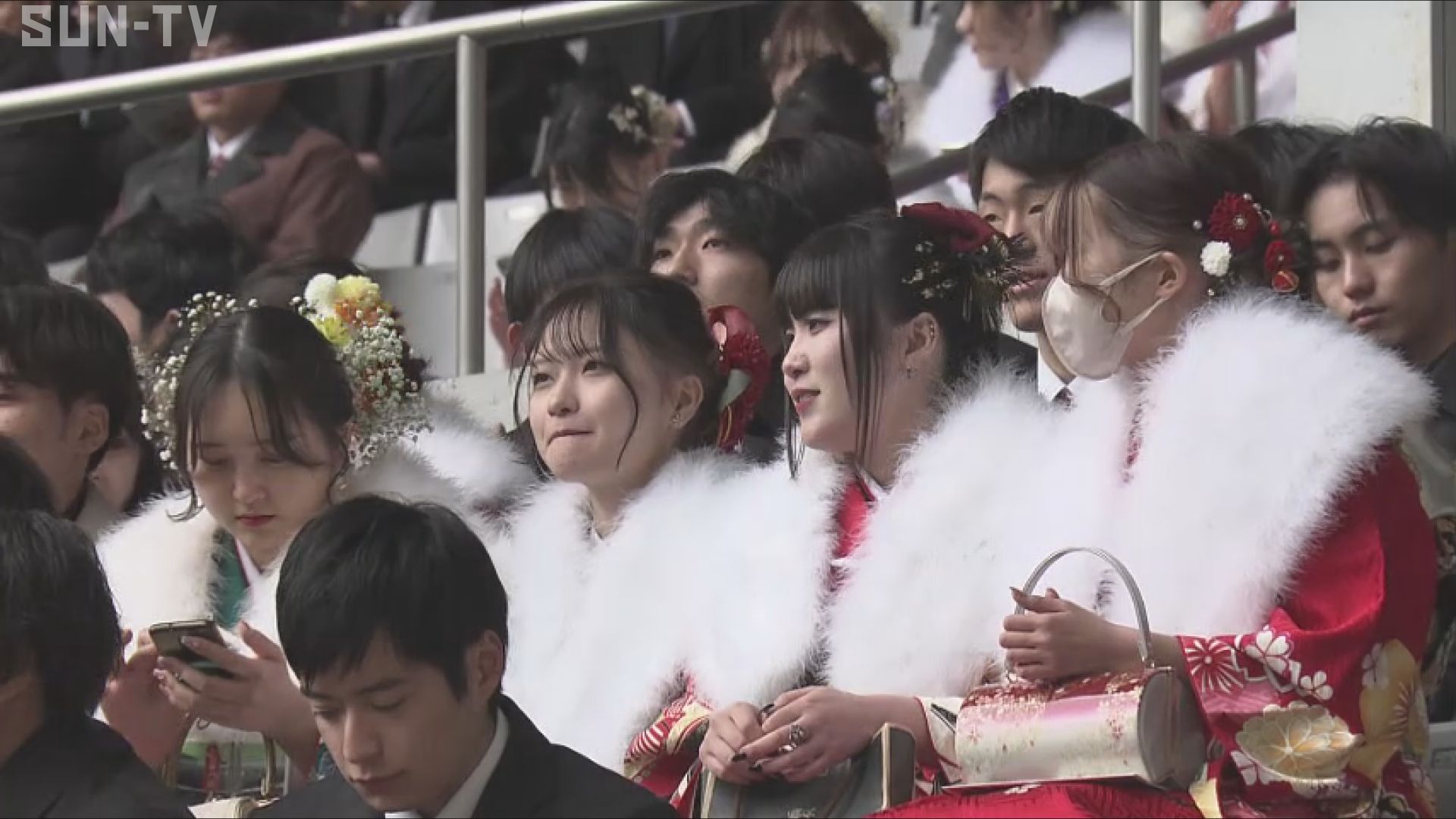 会場のノエビアスタジアム神戸には、華やかな振り袖やスーツに身を包んだ若者たちが集まりました。
