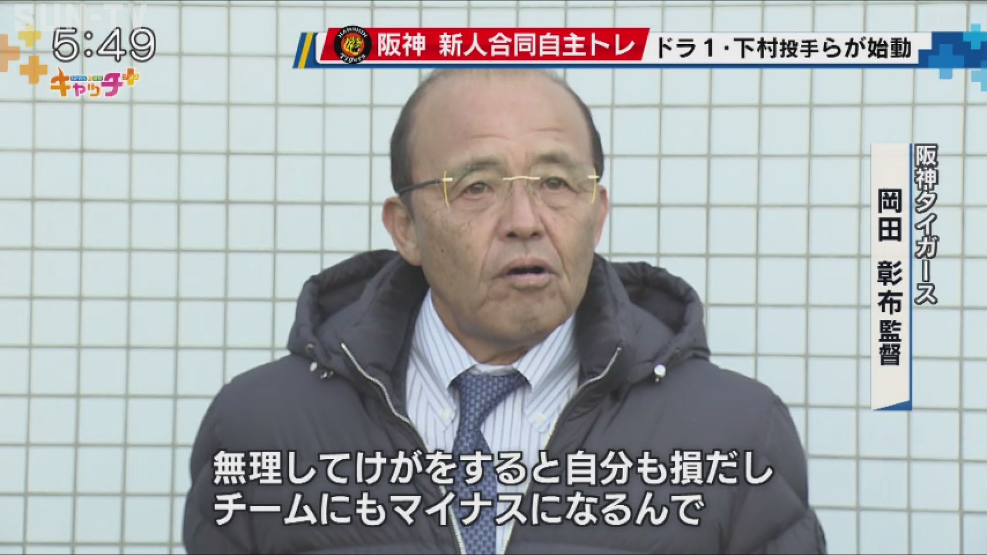 途中、チームを38年ぶりの日本一に導いた岡田監督が球場を訪れ、選手たちを視察。「焦らず体をつくって、早くチームの一員になれるよう頑張ってほしい」などと激励しました。