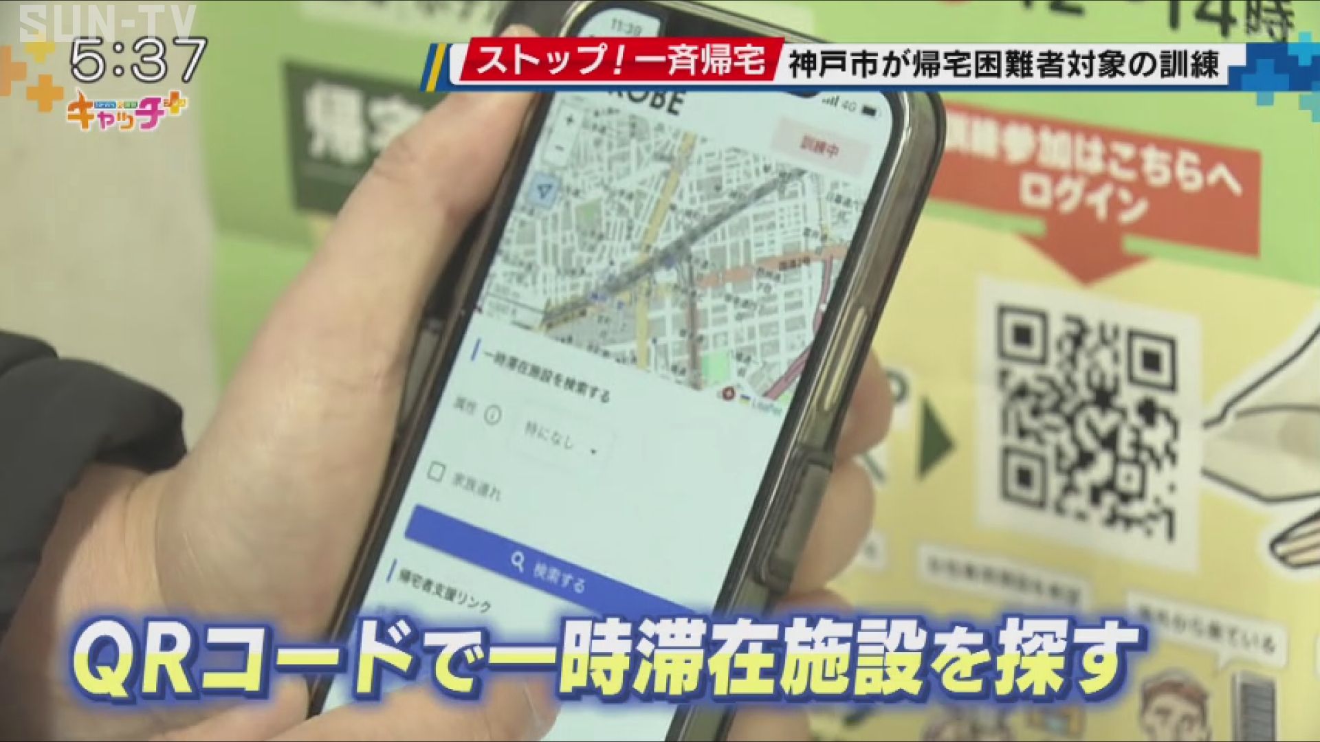 訓練の参加者は、神戸市が開発中の帰宅困難者対策支援システムを活用して最も近い施設を検索。