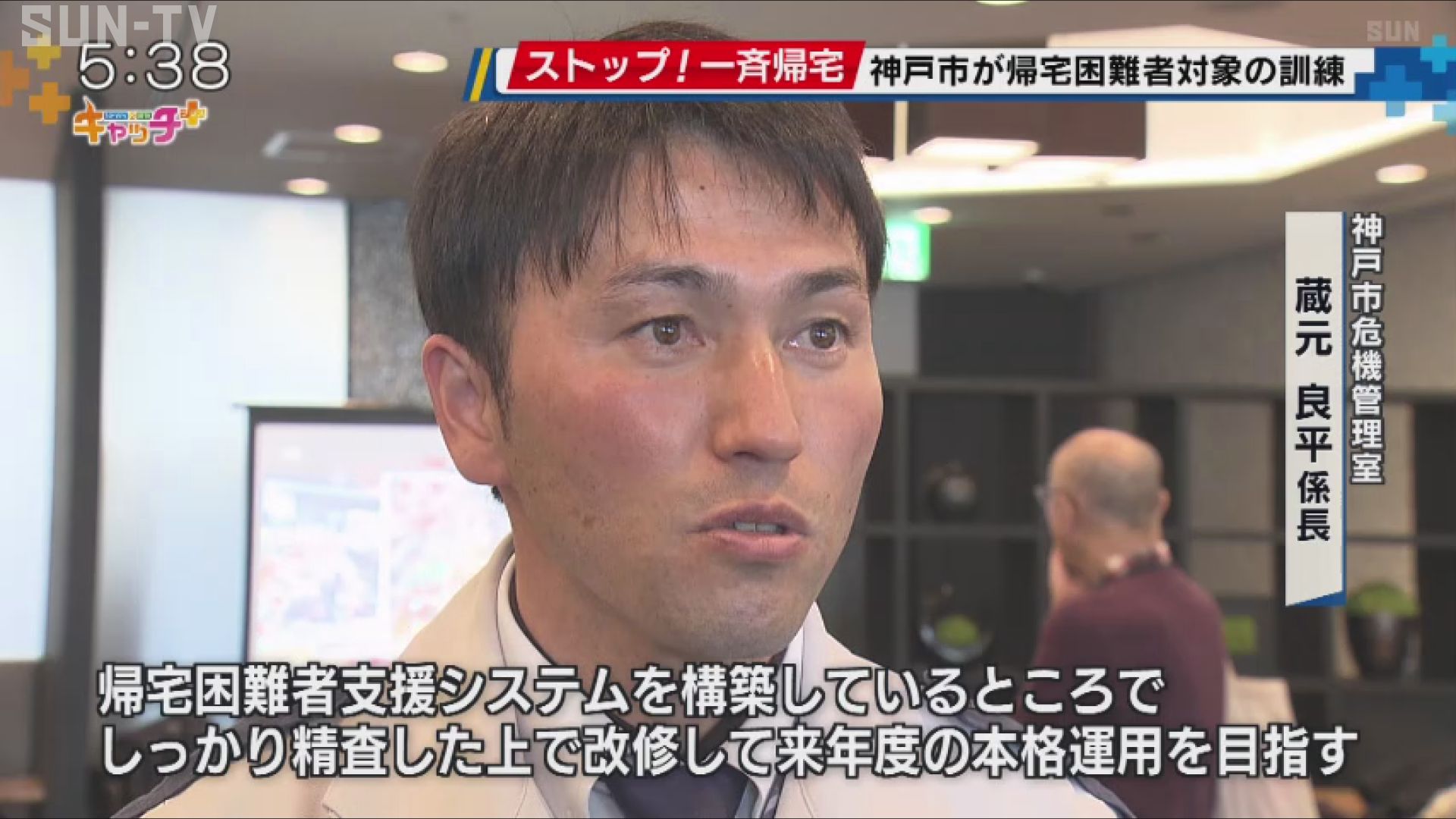 大規模災害が発生すると、電車やバスなど公共交通機関がストップし、神戸市中央区では最大20万人が帰宅困難になると想定されています。