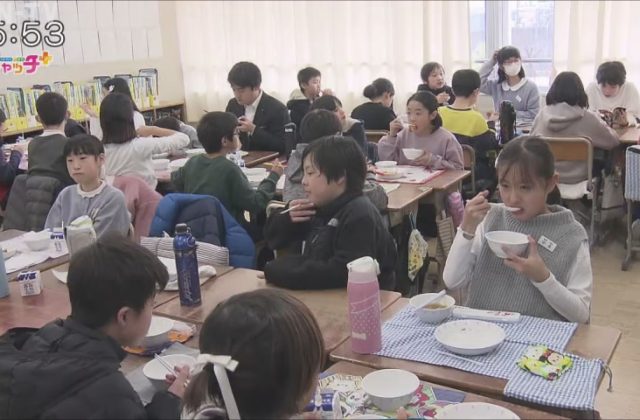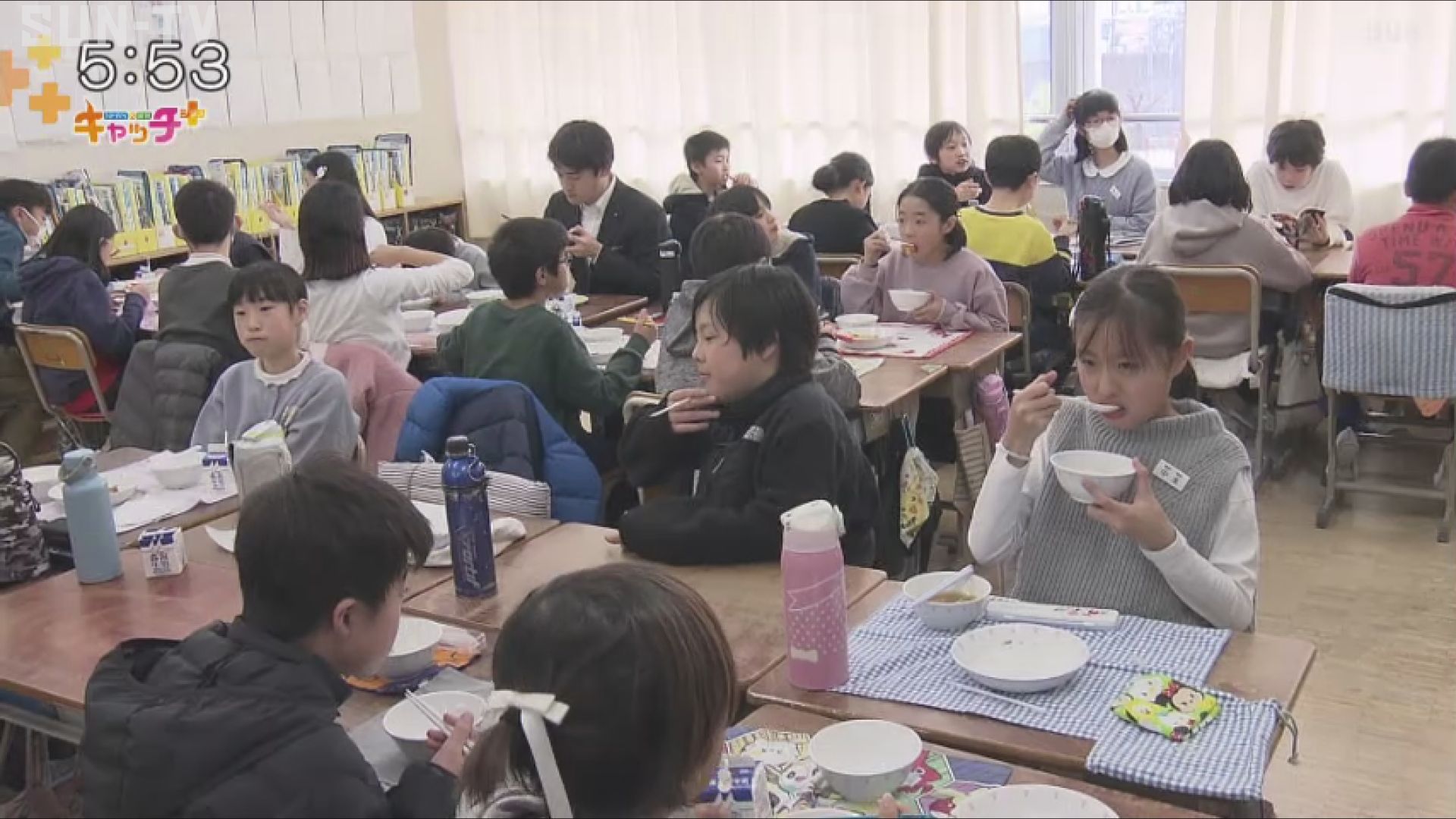 ホタテは市内の小中学校11校に6620人分、398キロが届けられ、5年3組の教室では、児童と一緒に髙島市長もホタテの給食を堪能していました。