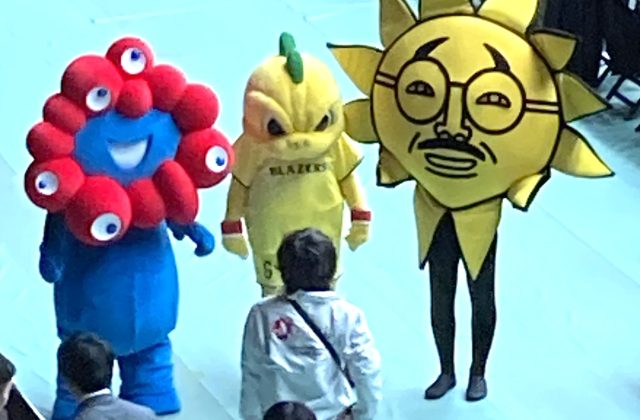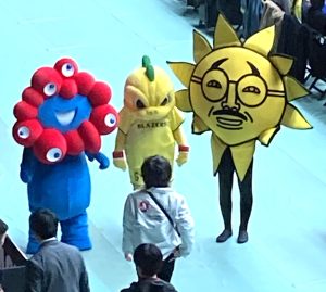 17日の試合はサンテレビで生中継し、会場には大阪・関西万博の公式キャラクター「ミャクミャク」、ブレイザーズのマスコットキャラクター「二代目 我王(ガオウ)」に加えて、サンテレビの「おっ!サン」も登場した。