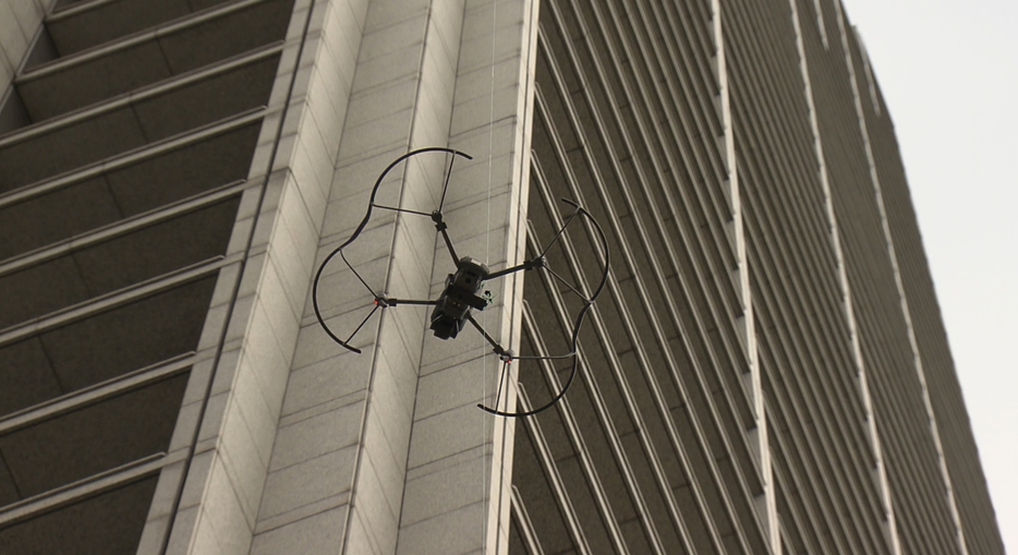 神戸市役所の建物を、ドローンがラインを伝って上っていきます。