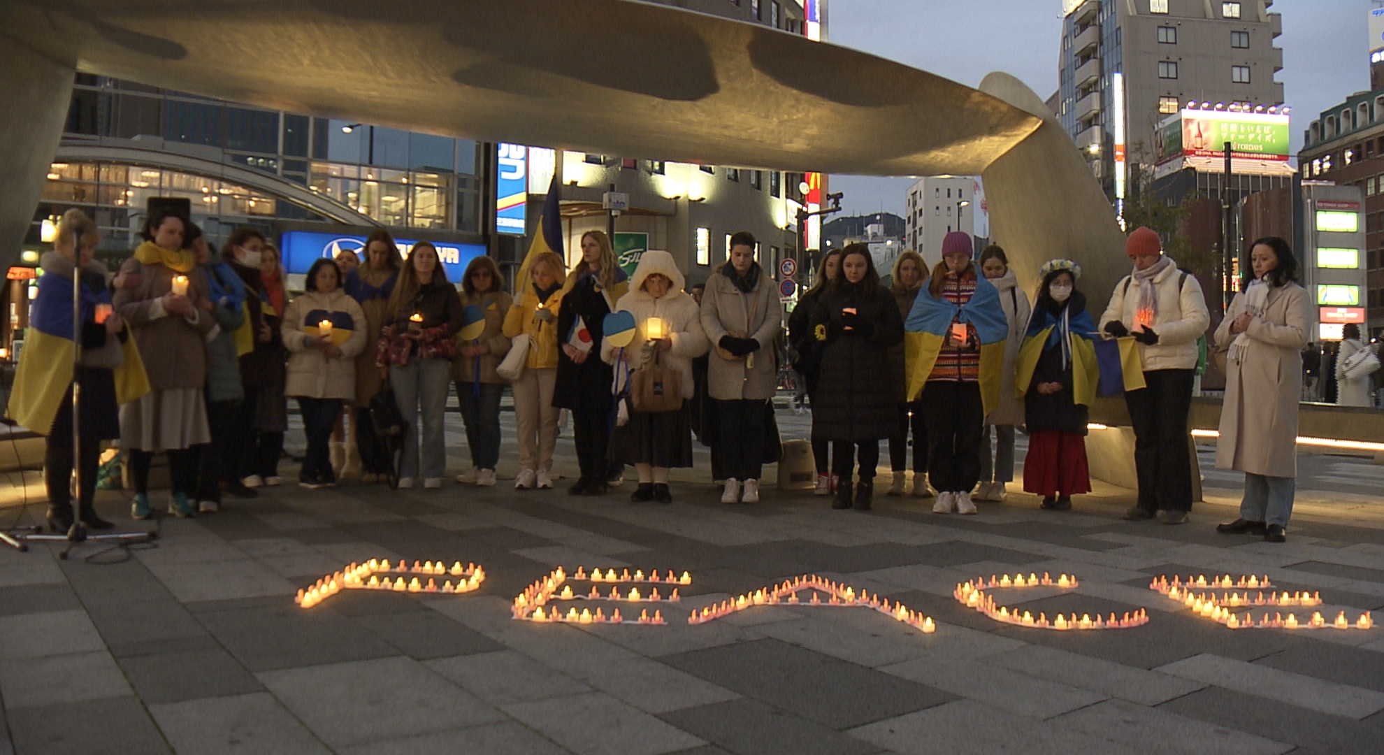 集まった人たちは、ろうそくに灯りを灯し、戦争の犠牲者に向けて祈りを捧げていました。