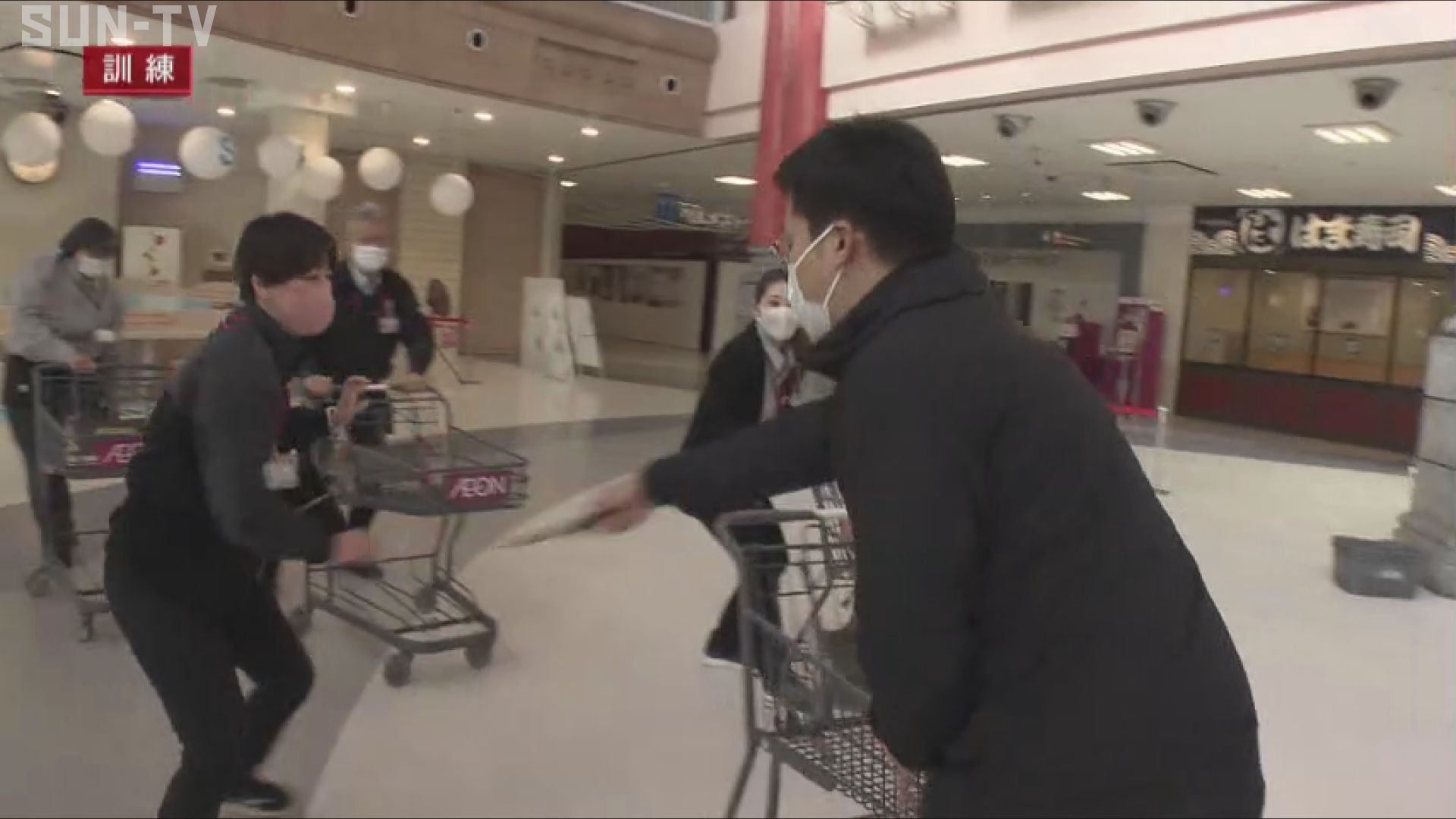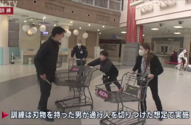 訓練は、施設内で刃物を持った男が通行人を切りつけた想定で行われ、従業員は客を誘導する人やカートを使って犯人を制圧する人、警察に通報する人に分かれ、警察が到着するまでの対応を学びました。