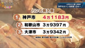 年間の購入額は4万1183円。神戸市がパンの購入額で1位になるのは、4年ぶりです。ちなみに、2位は和歌山市、3位は大津市でした。