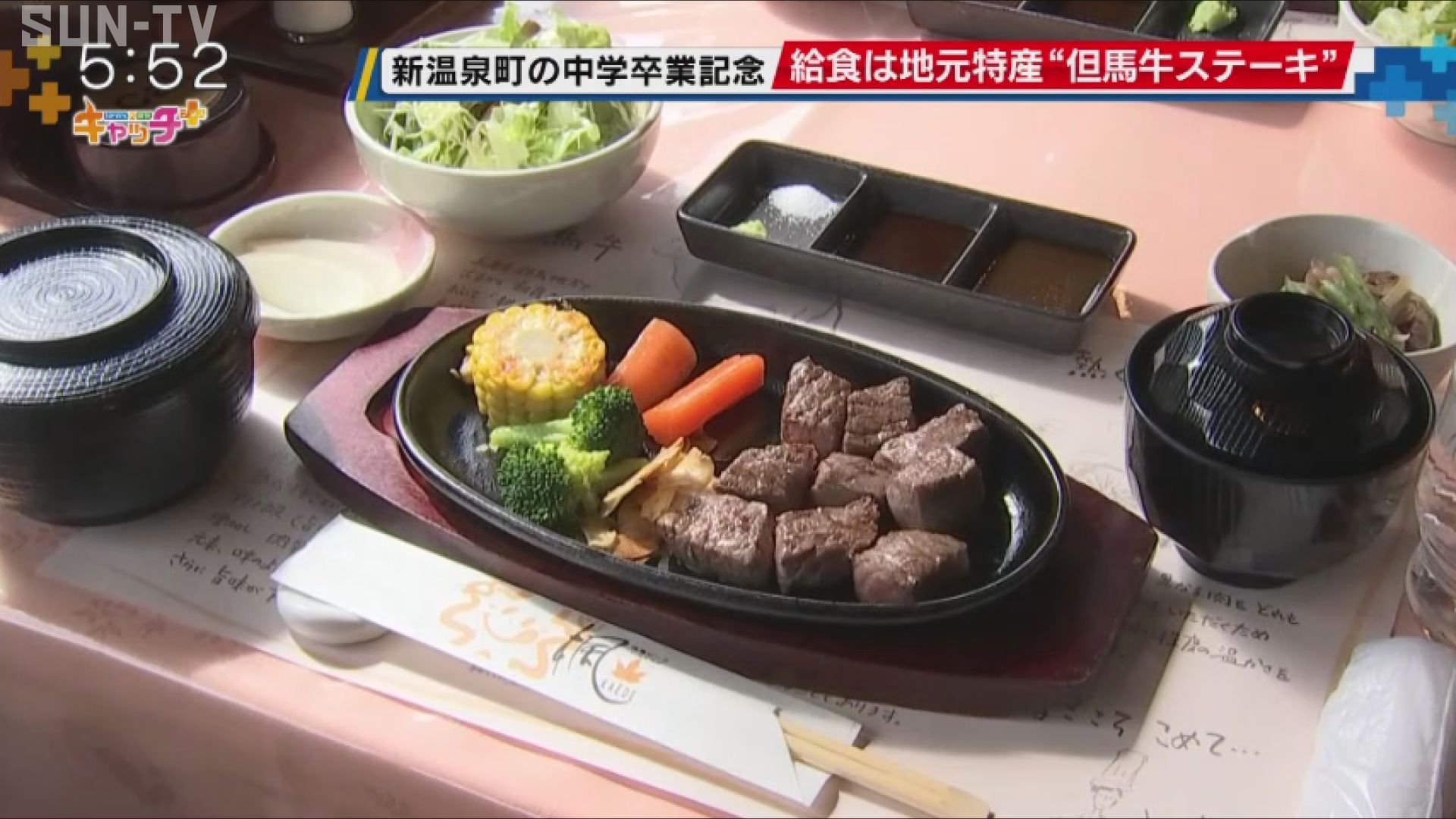 新温泉町で、卒業を間近に控えた中学3年生に、地元の特産「但馬牛のステーキ」を振る舞う毎年恒例の特別給食会が開かれました。