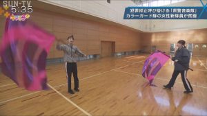 中村さんは慣れない道具に苦戦していました。体育館には落下したフラッグの音が響きます。