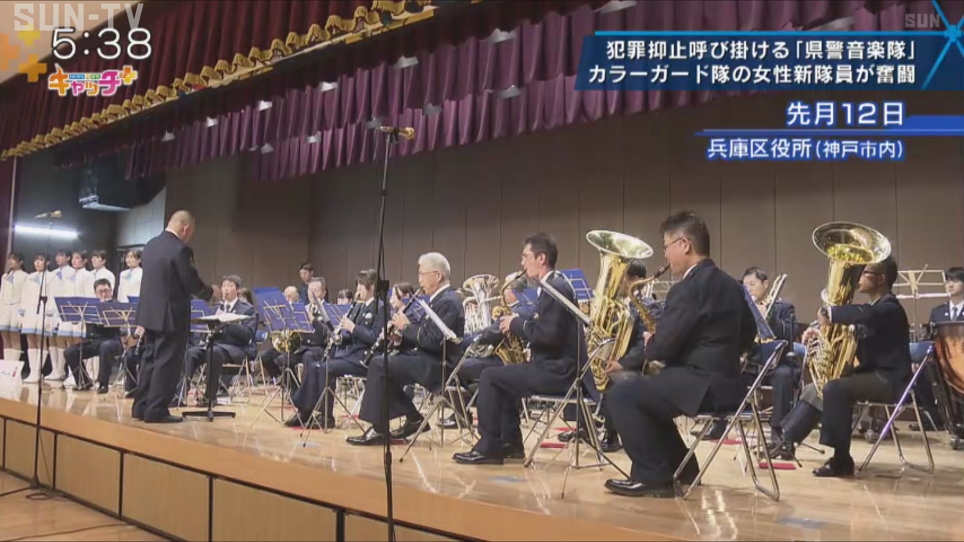 1951年に創設され、現在34人が所属している「兵庫県警音楽隊」。楽器やフラッグを手に持ち、迫力ある演奏で防犯を呼びかけています。
