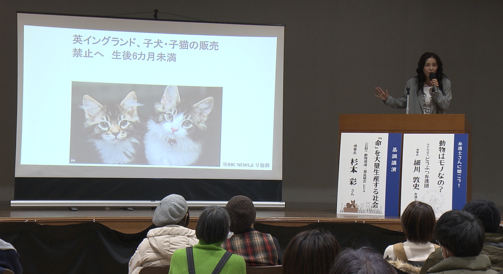杉本さんは、参加したおよそ100人に向け、劣悪な環境で繁殖をくり返すブリーダーの存在や、ペットショップでの販売を禁止している国があることなどを説明し、より強い法整備が必要だと訴えました。