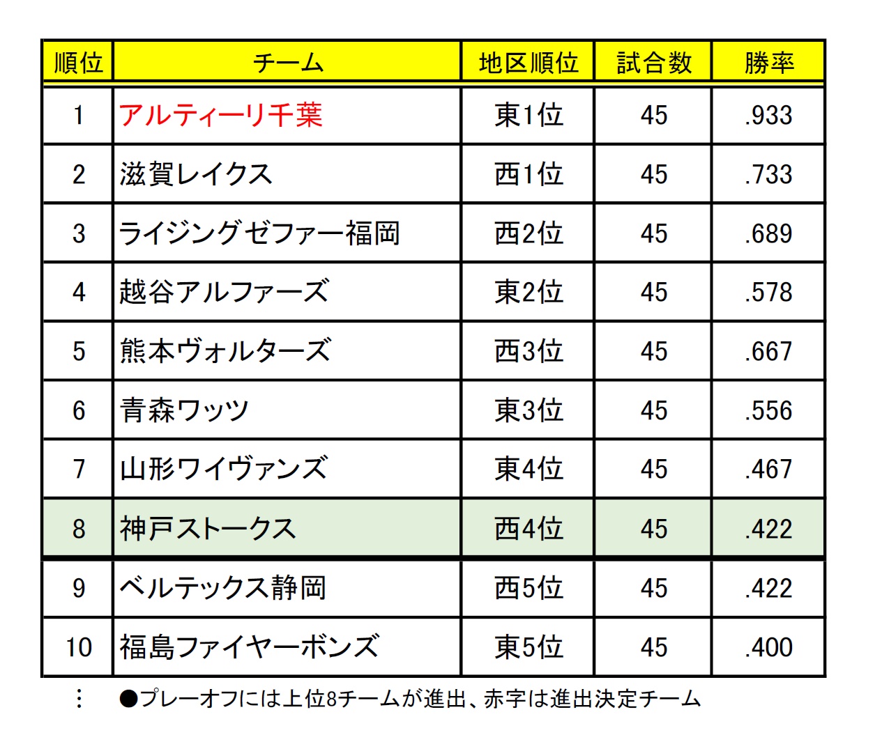 ストークスは痛い連敗を喫したが、プレーオフ進出を争っている静岡も連敗したため、勝率で静岡に並ばれているものの全試合の得失点差で上位に立ち、