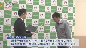 2月20日。兵庫パルプ工業は、厚生労働省から、中小企業を評価する制度のうち、障害者雇用に積極的な事業所に贈られる「もにす」と、若者の採用や育成・雇用管理が優良な企業を評価する「ユースエール」の認定を受けました。