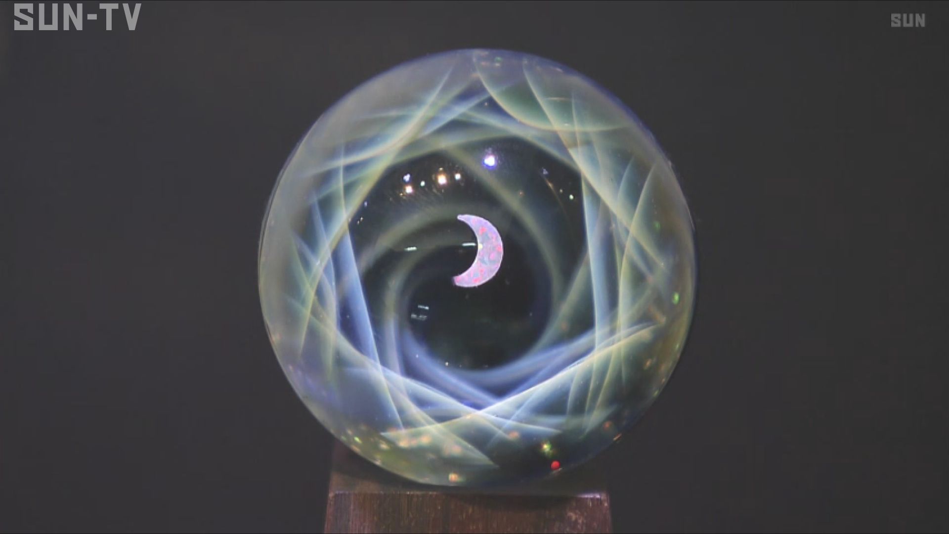 展示されているのは直径数センチから10センチほどと小さく、気泡を閉じ込めて水の世界を表現したものや天空に浮かぶ月を描き宇宙を表現した作品。