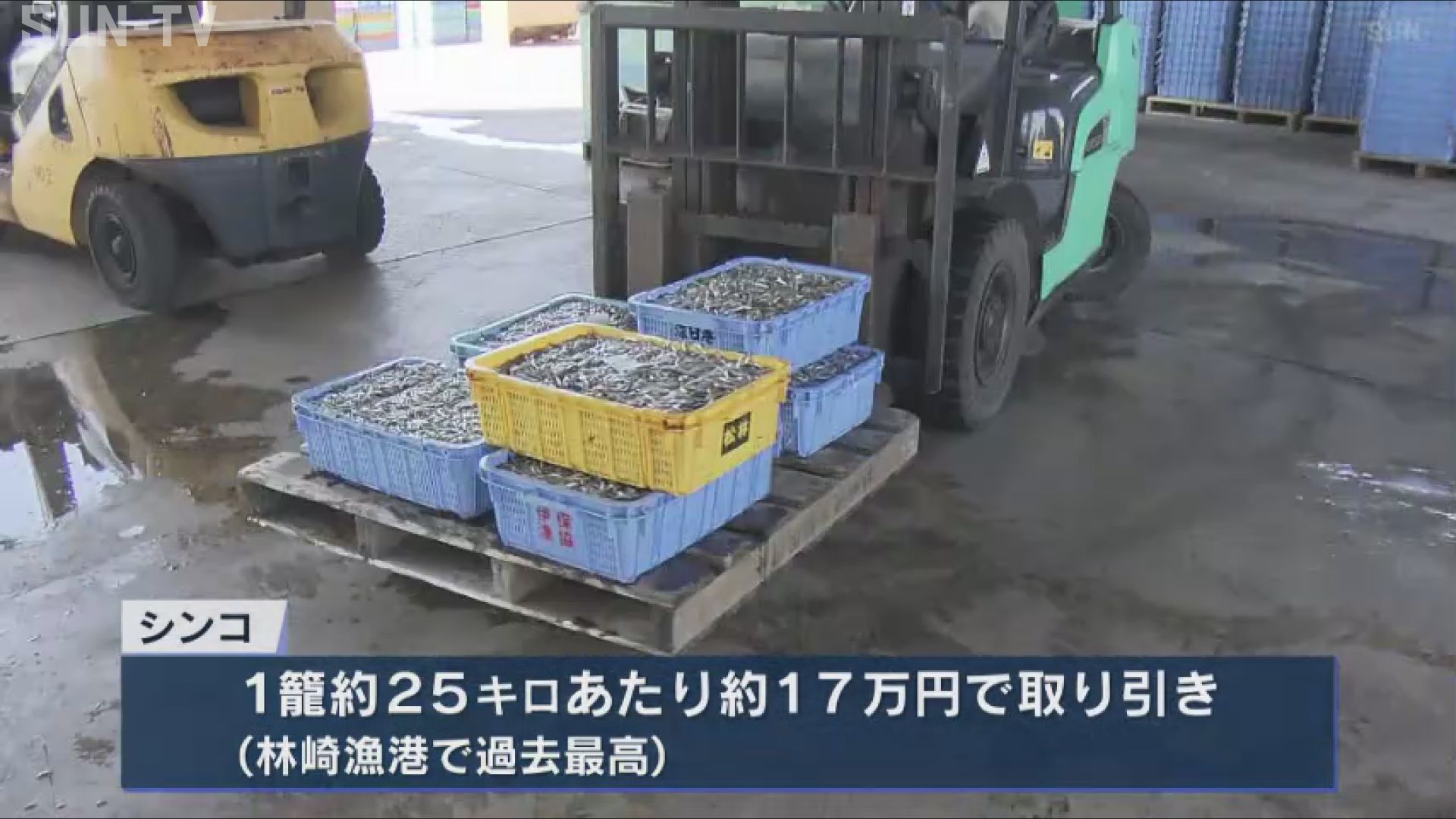 11日朝に水揚げされたシンコは早速競りにかけられると、1かご約25キロあたり林崎漁港で過去最高となる約17万円で取り引きされました。