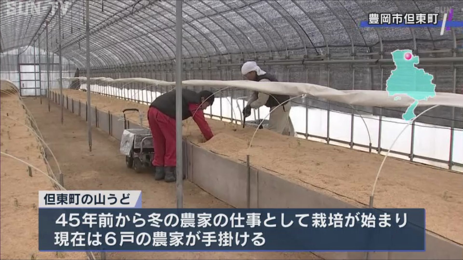 豊岡市但東町では、冬の農家の仕事として、45年前から「山うど」の栽培が始まり、現在は6戸の農家が手掛けています。