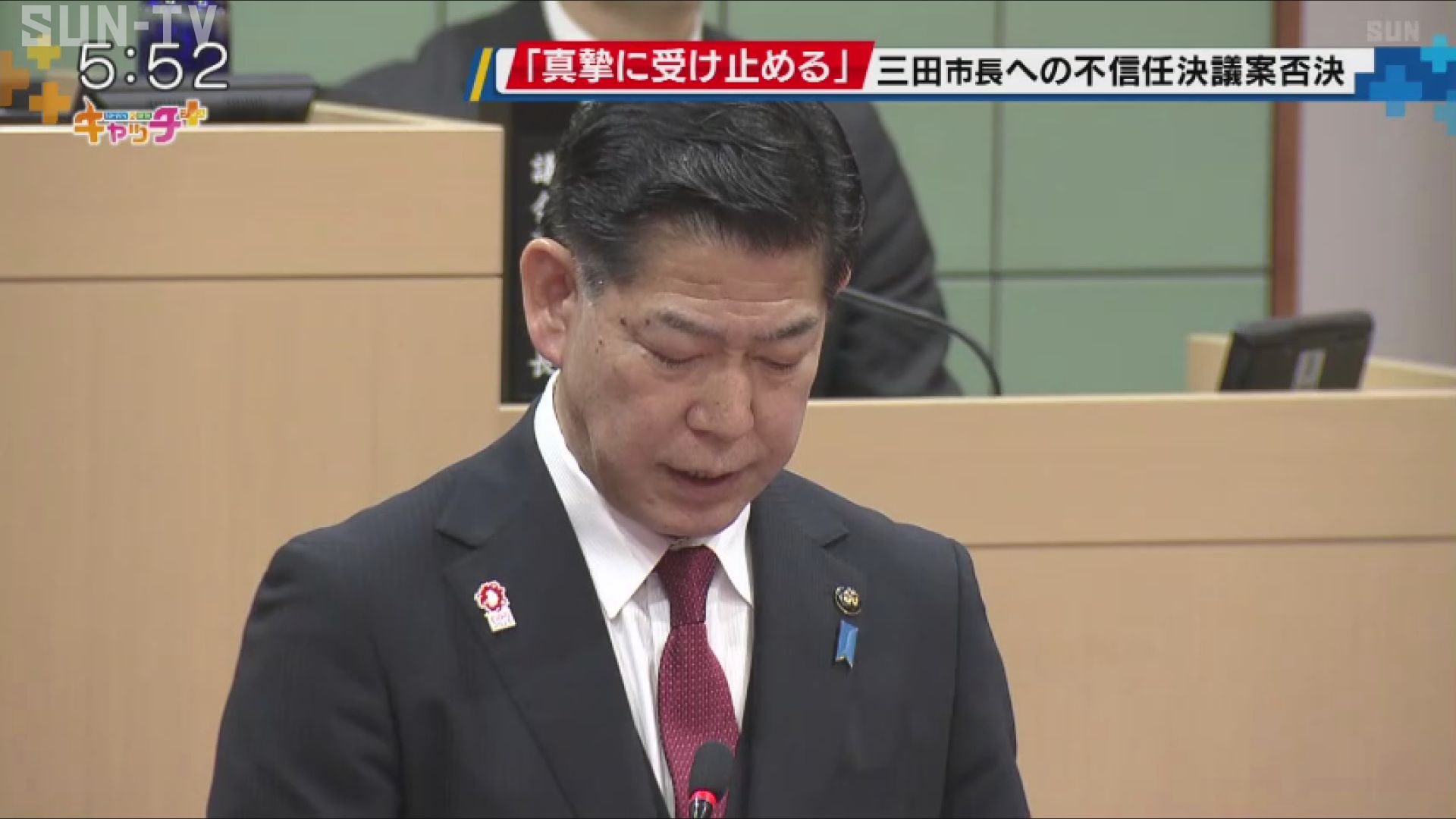これを受け、3月28日の市議会本会議で、「市長就任からわずか3カ月半で公約を撤回した他、重要課題であった子どもの医療費や中学校給食の無償化についても予算として計上されないなど発言が無責任である」などとして共産党と日本維新の会三田の議員が田村市長に対する不信任決議案を提出しました。