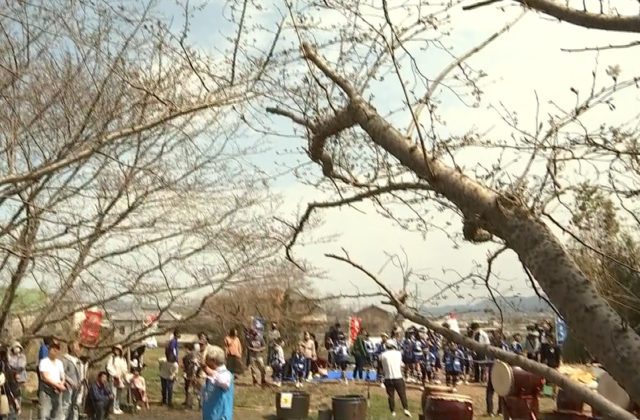 2024年はサクラの開花が遅く、満開まではまだ時間がかかりそうだということですが、小学生の和太鼓グループ「和太鼓志童」が演奏し、イベントを盛り上げたほか、地元のヨモギを使った「志知城餅」100個が配られ、訪れた人は春の訪れを感じていました。
