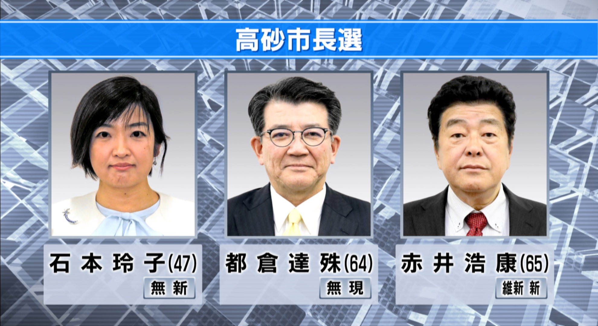 高砂市長選に立候補したのは、届け出順に、無所属新人で、元高砂市職員の石本玲子さん(47)、無所属で現職の都倉達殊さん(64)、日本維新の会新人で元高砂市議の赤井浩康さん(65)の3人です。