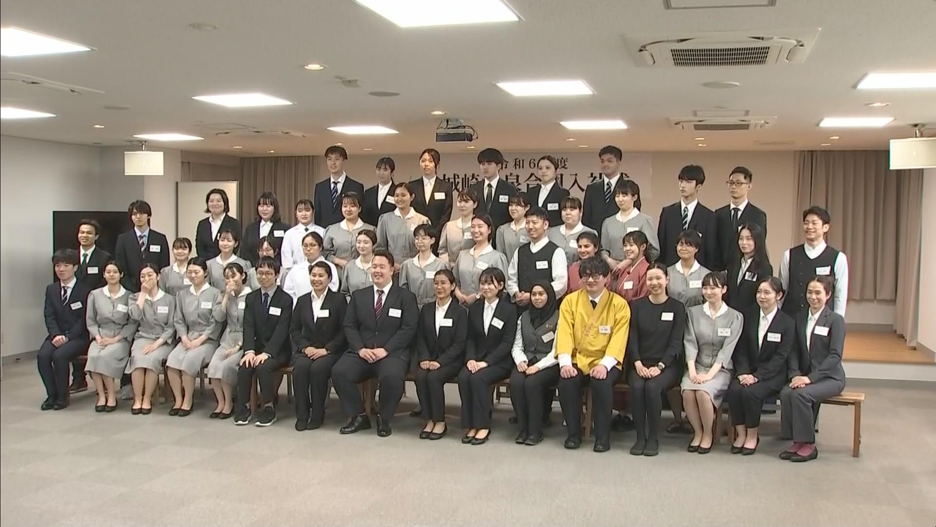 兵庫県豊岡市の城崎温泉で、旅館で働く新入社員を集めた合同入社式が開かれました。