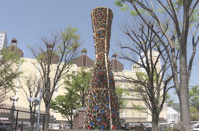 「神戸煉瓦倉庫」の横に設置された竹製の神戸ポートタワー。