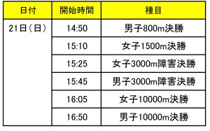 21日は、女子1500mのほか、男女10000m、男女3000m障害、男子800m、男女走り幅跳び、女子棒高跳び、男女砲丸投げ、男女円盤投げのグランプリ競技が行われる。