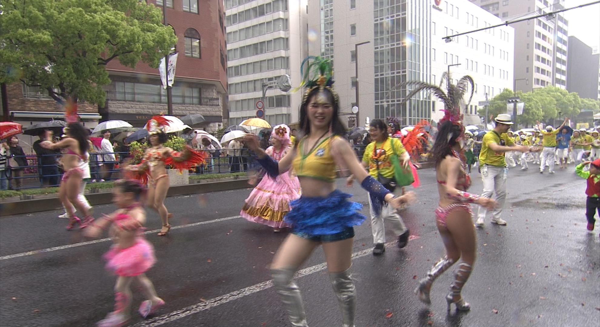 神戸市婦人団体協議会のおよそ800人による総踊りに続いておまつりパレードでは、5月、神戸で開催される世界パラ陸上の開催記念行進を先頭に、色とりどりの衣装をまとったサンバチームなどが登場しました。