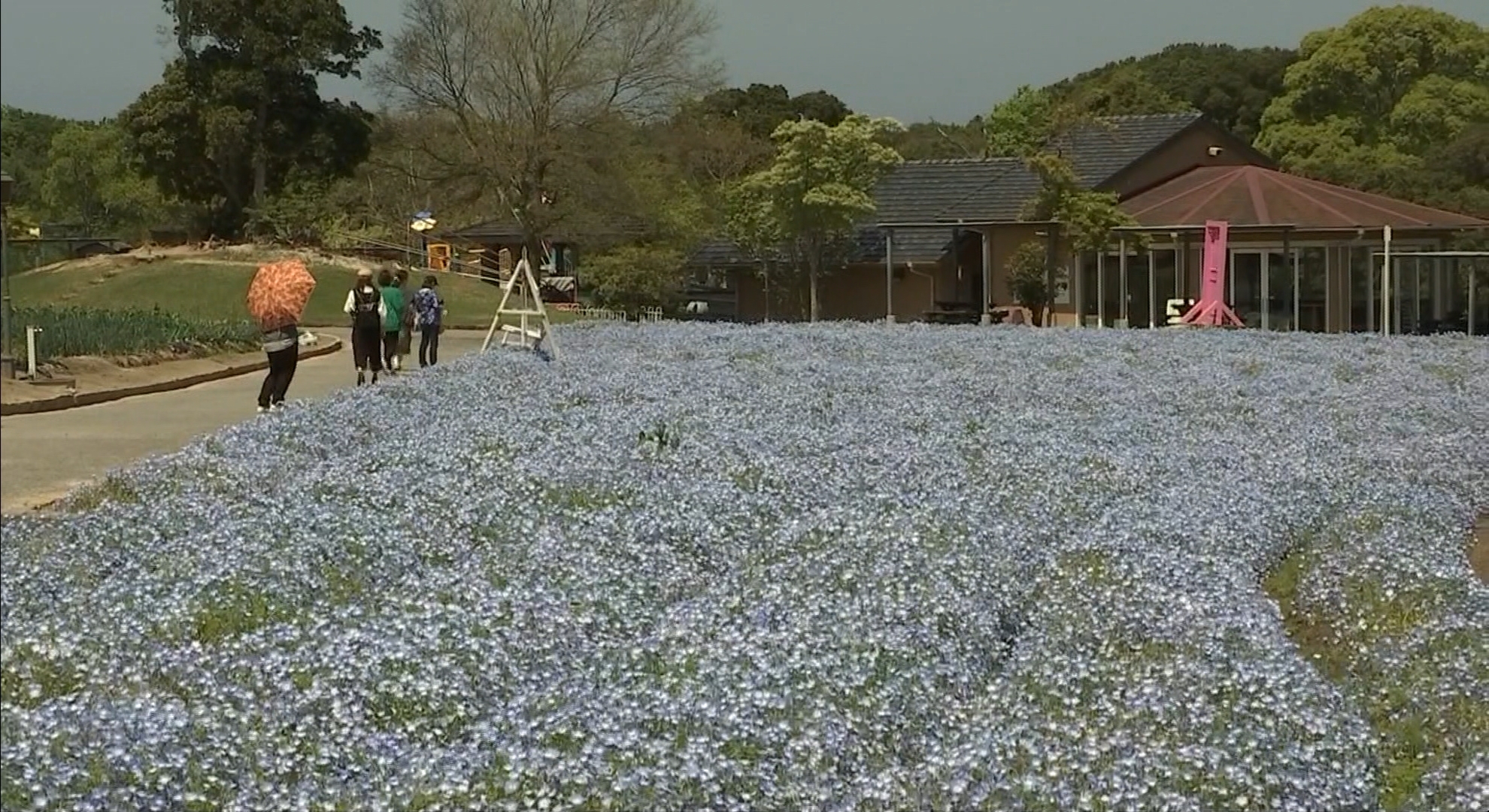 兵庫県南あわじ市の農業公園「イングランドの丘」では、小さな青い花びらをつけたネモフィラが見頃を迎え、訪れた人を楽しませています。