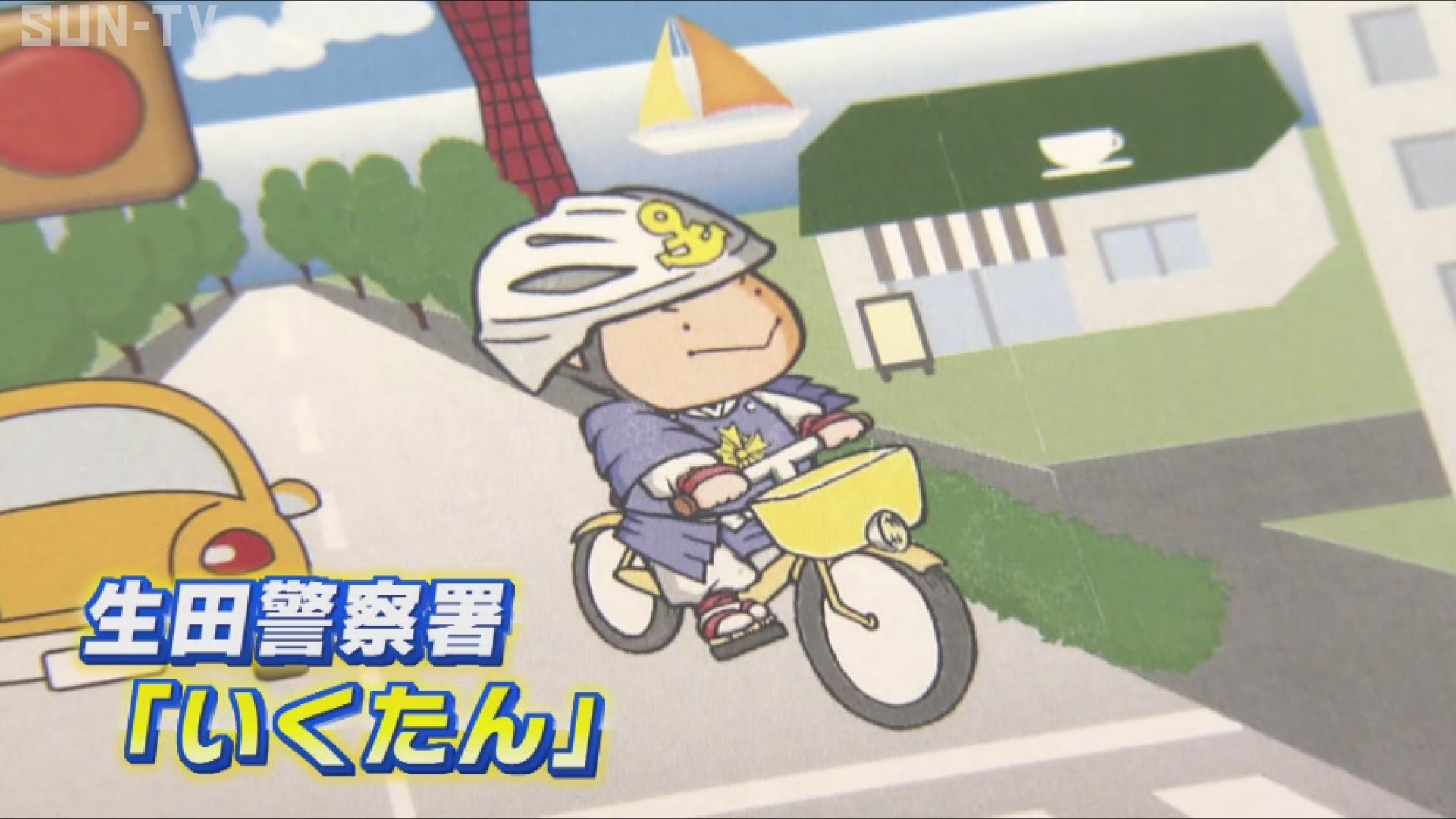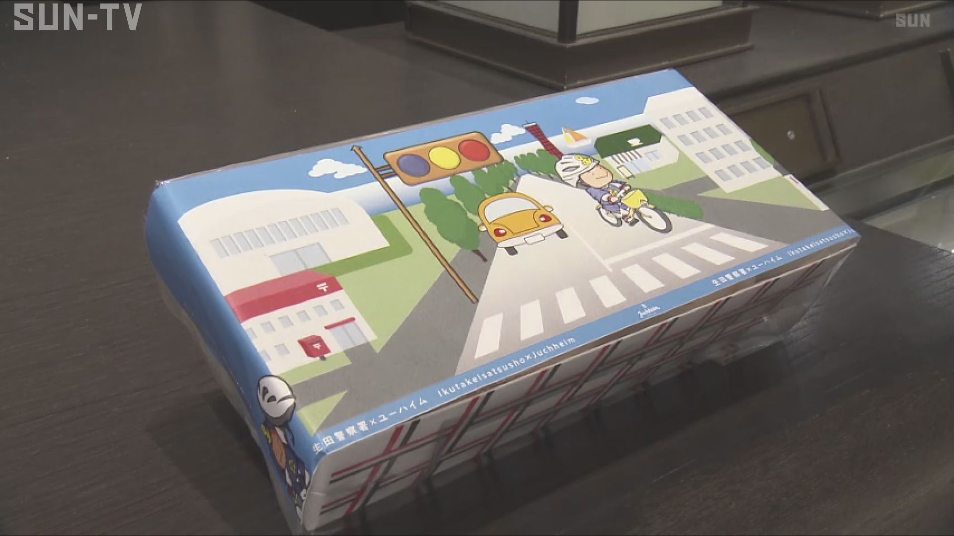 30日から販売されるバウムクーヘンのパッケージには、ヘルメットをかぶって自転車に乗った生田警察署のキャラクター「いくたん」が描かれ、自転車の正しい乗り方を呼び掛けています。