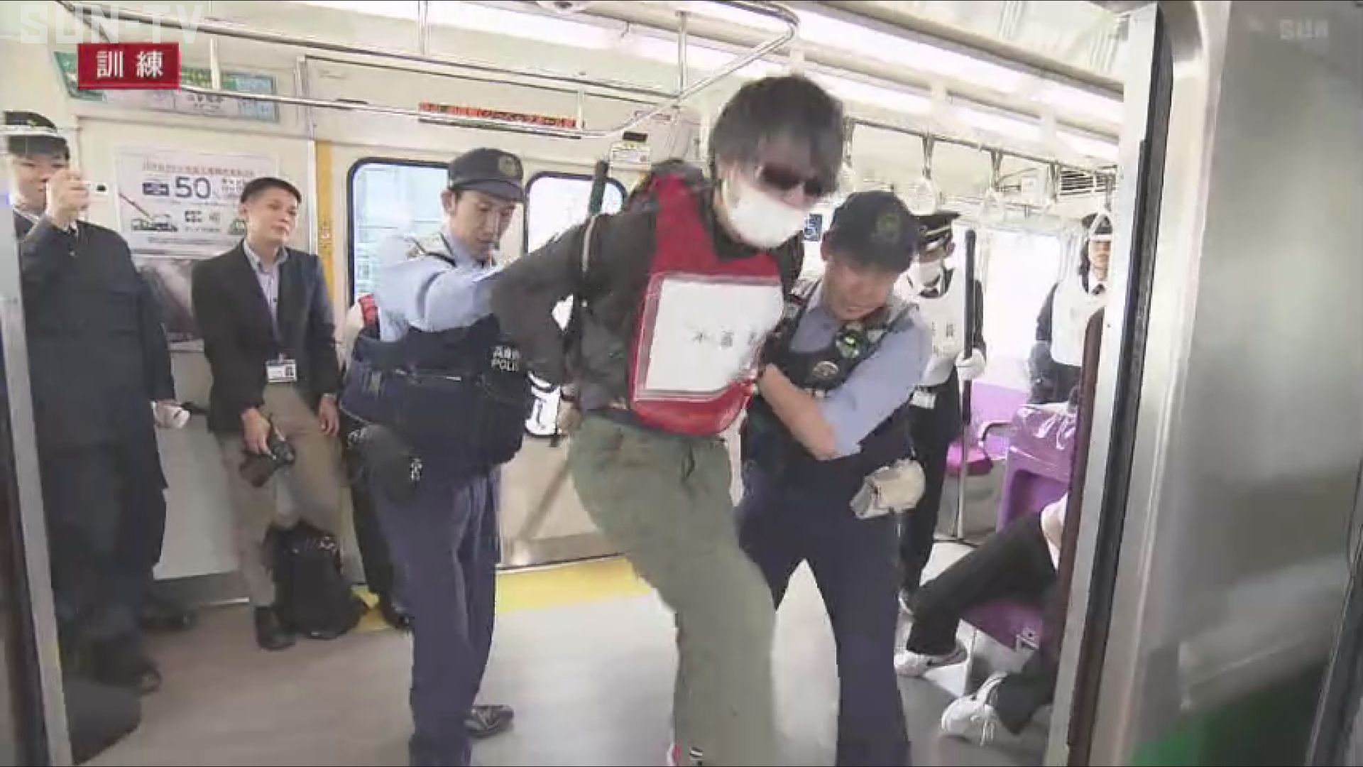 訓練は、刃物を持った男が、乗客2人を切りつけた想定で行われ、非常通報を受けた駅員が、刺股で男を制止。