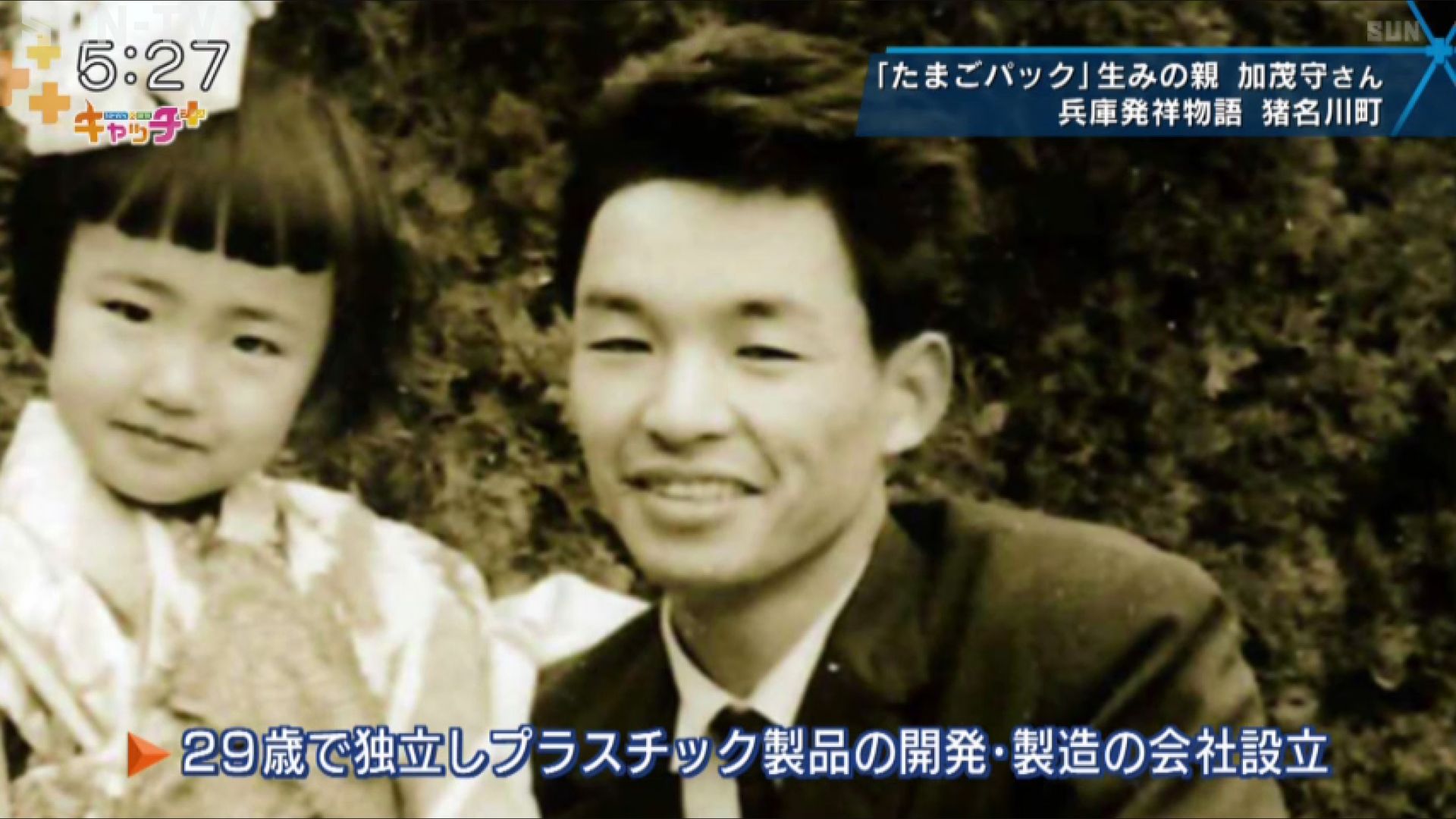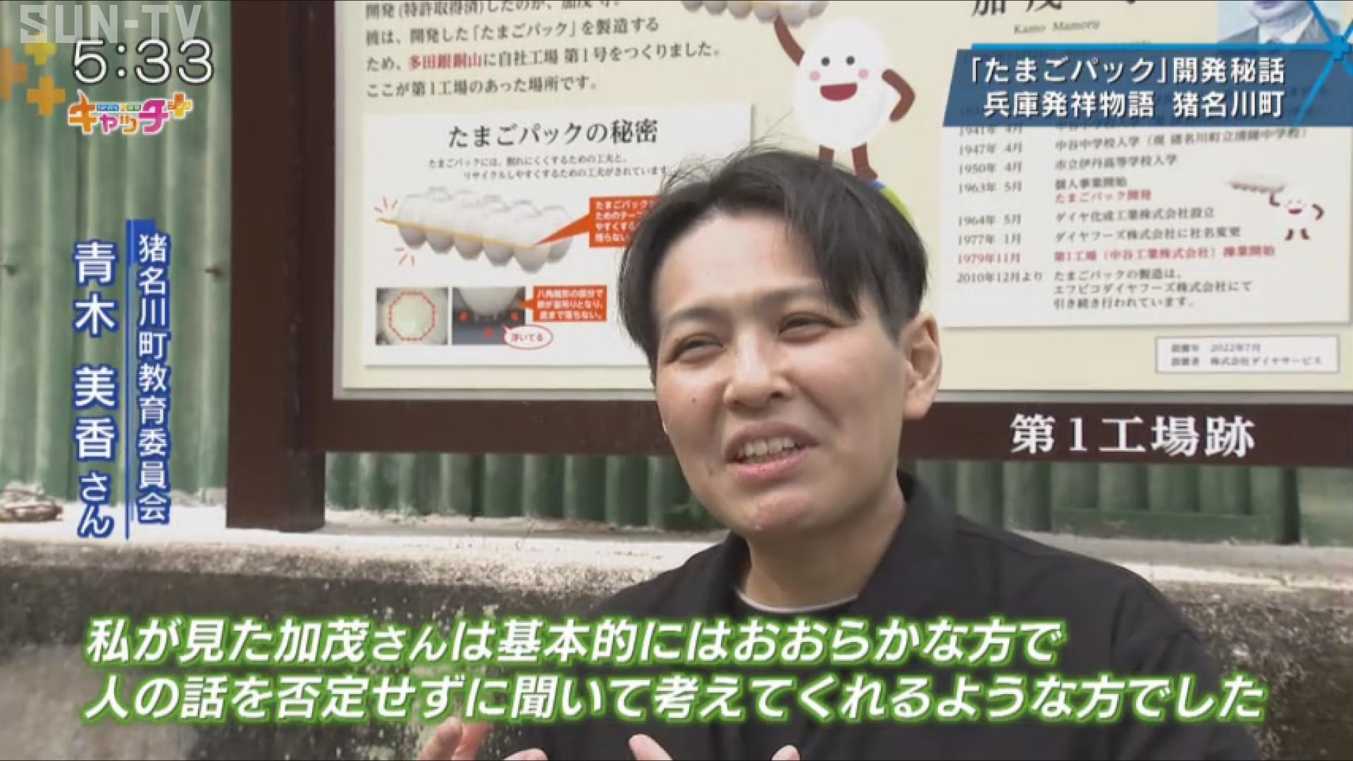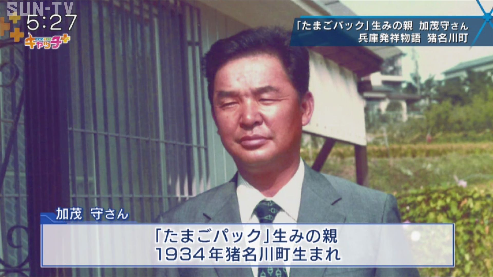 「こちら加茂守さんなんですけど、猪名川町の広根というところのご出身の方で、スーパーでよく見かける『卵パック』を発明された方になります」