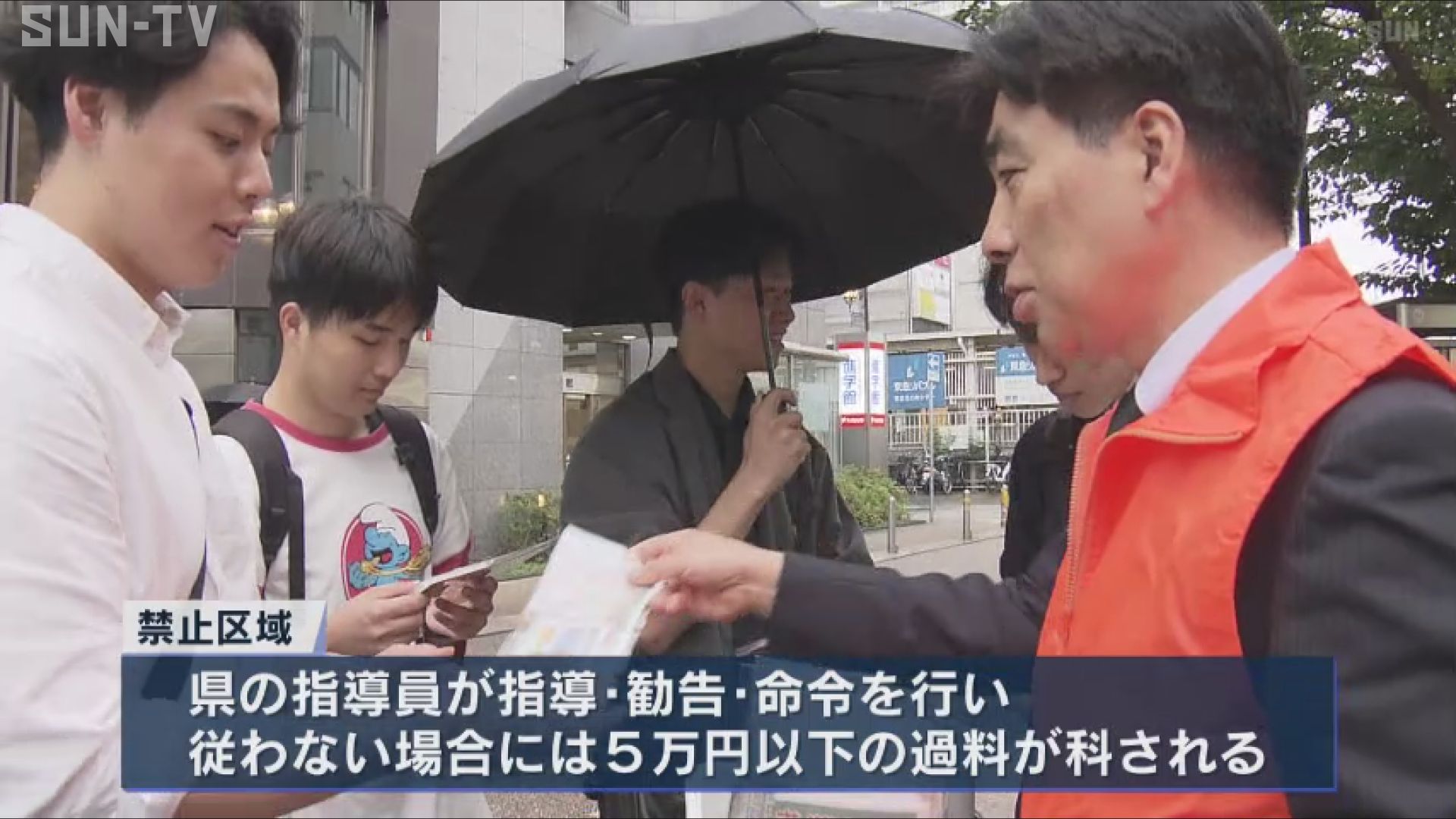 禁止区域では、県の指導員が指導や勧告、命令を行い、命令に従わない場合には5万円以下の過料が科されます。