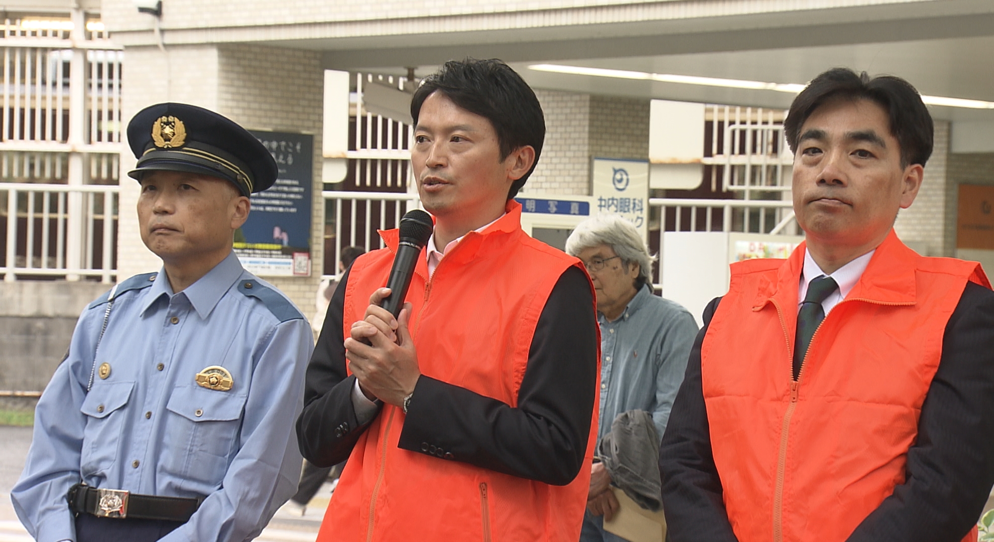 阪急西宮北口駅前で呼びかけを行う兵庫県・斎藤元彦知事