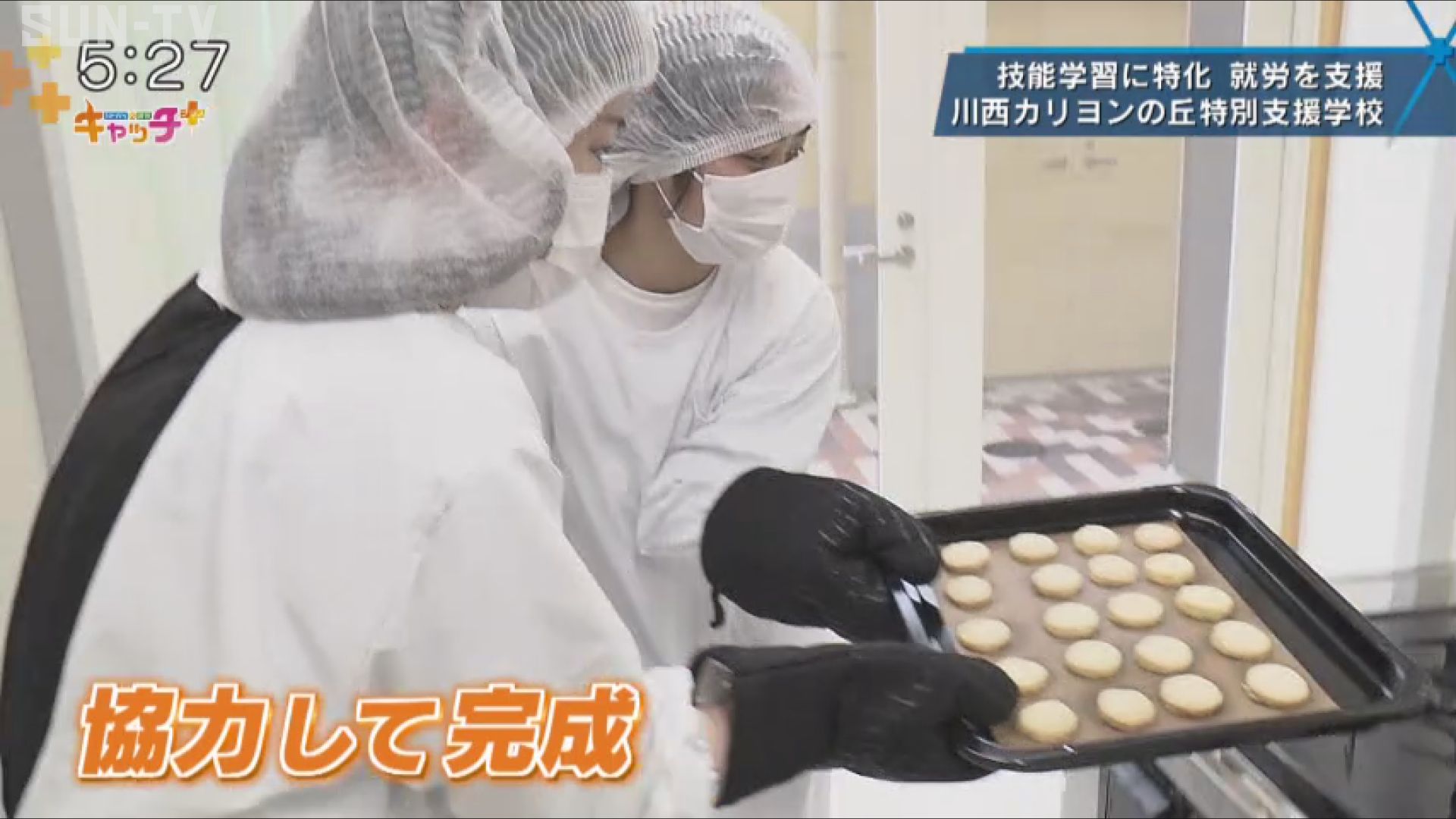 食品加工室です。高等部の生徒たちがクッキーを製作。材料を正しく計量し、ひとつずつ袋づめしています。