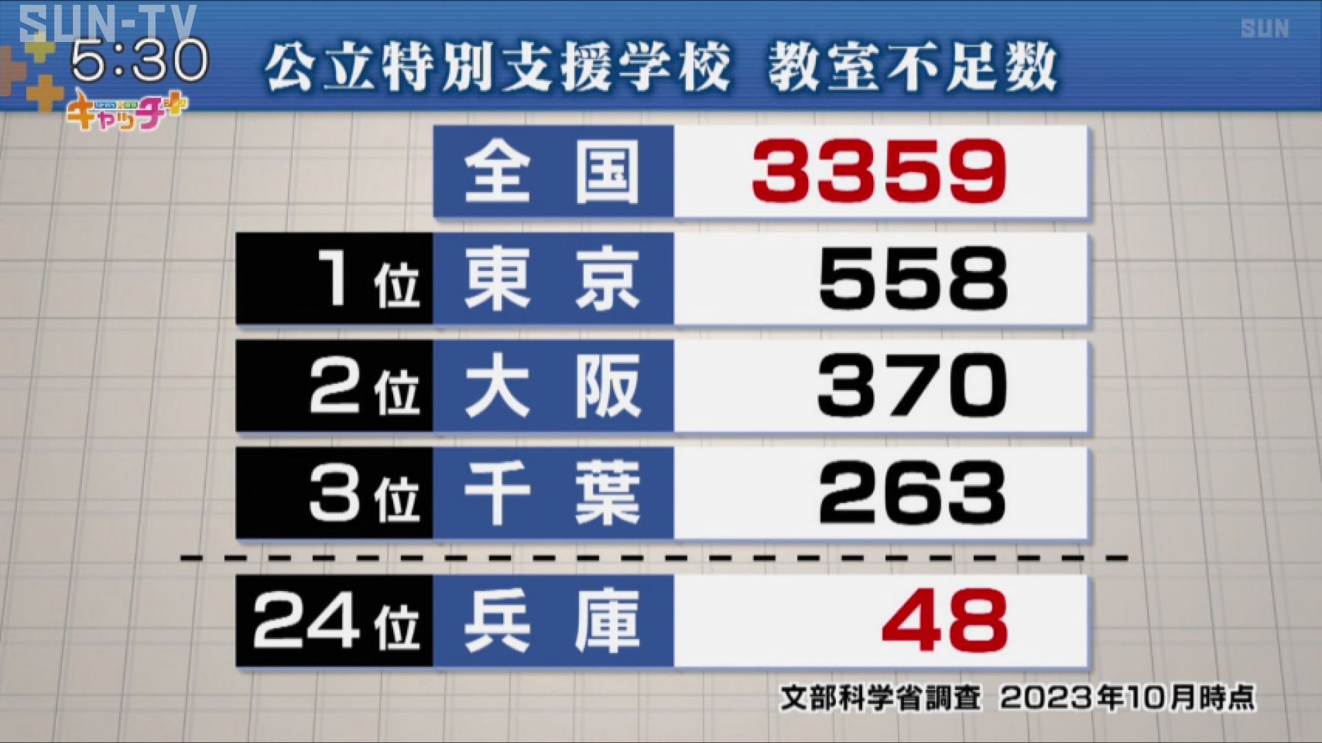 去年10月時点で全国では3359の教室が不足。兵庫の不足数は48と、47都道府県中、全国ワースト24位となっています。