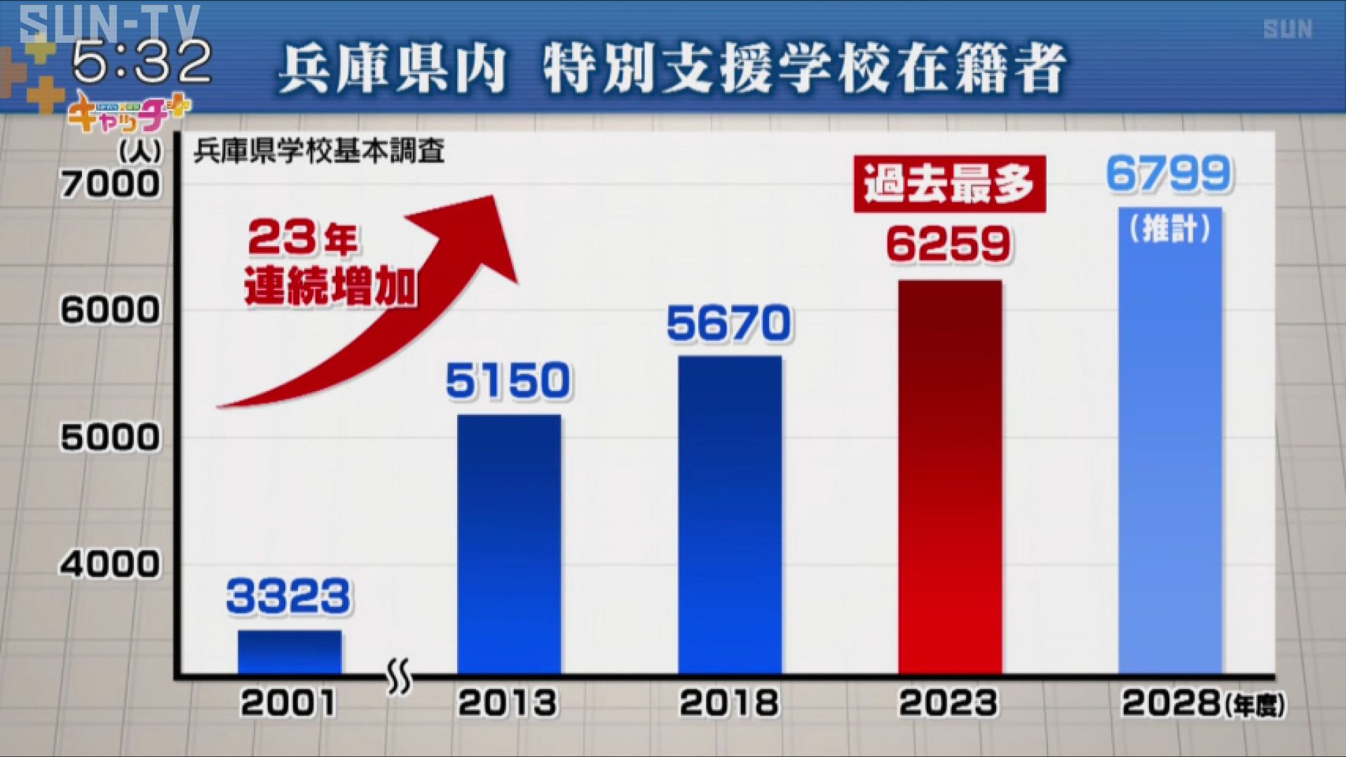 県内の特別支援学校の在籍者は2023年度で6259人と過去最多を更新。23年連続で増加していて、県では2028年度には6799人になると推計しています。