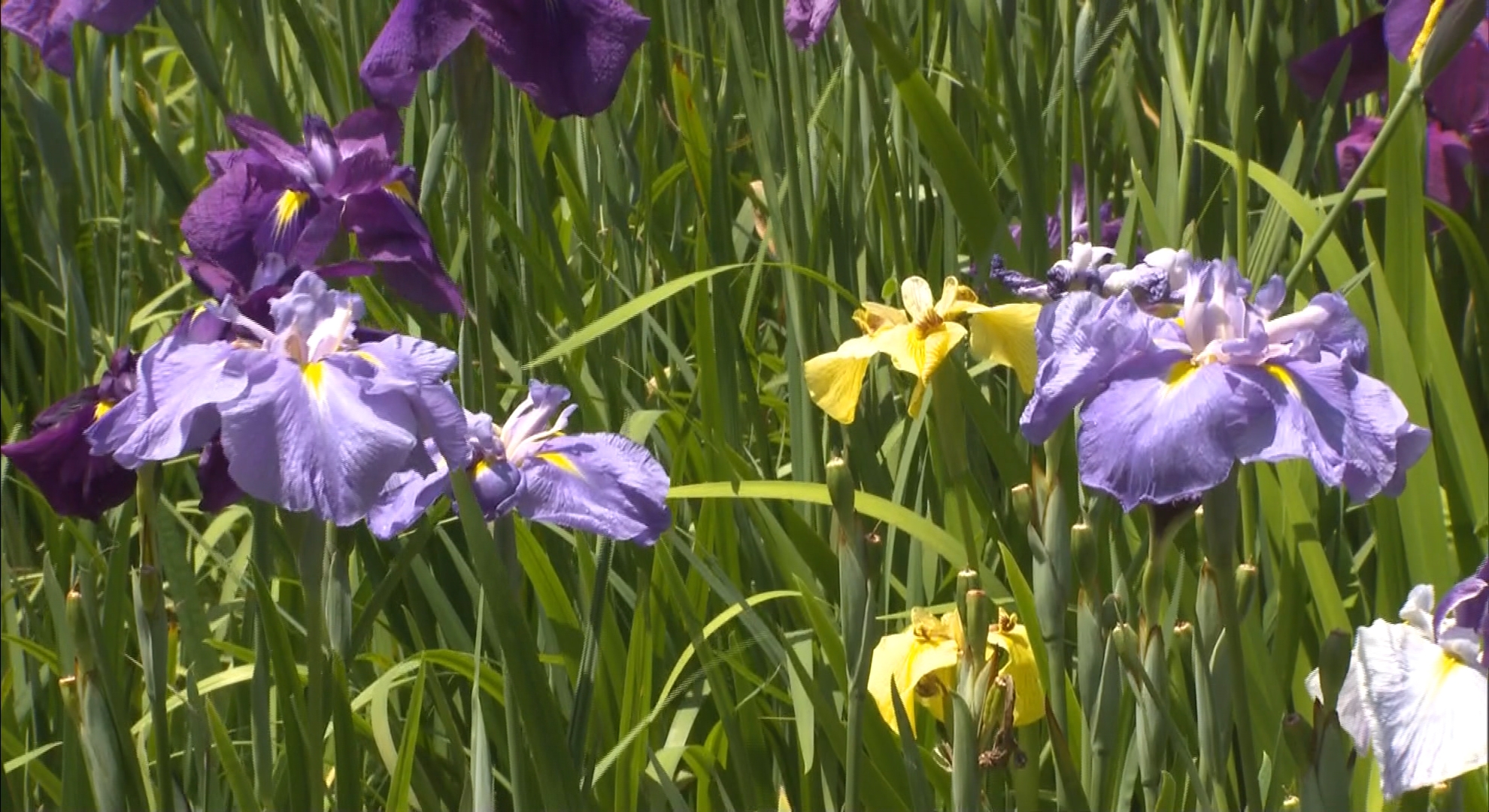 兵庫県佐用町で、水辺に咲く色とりどりのハナショウブが見頃を迎えています。
