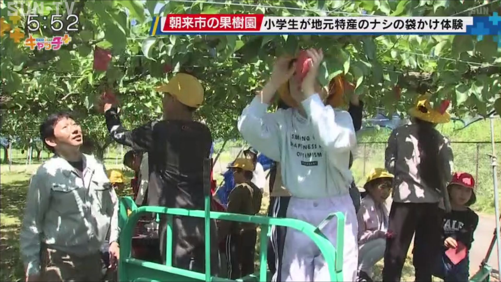 朝来市の果樹園では、地元の小学生たちが、病気や害虫からナシを守るための袋かけ作業を体験しました。