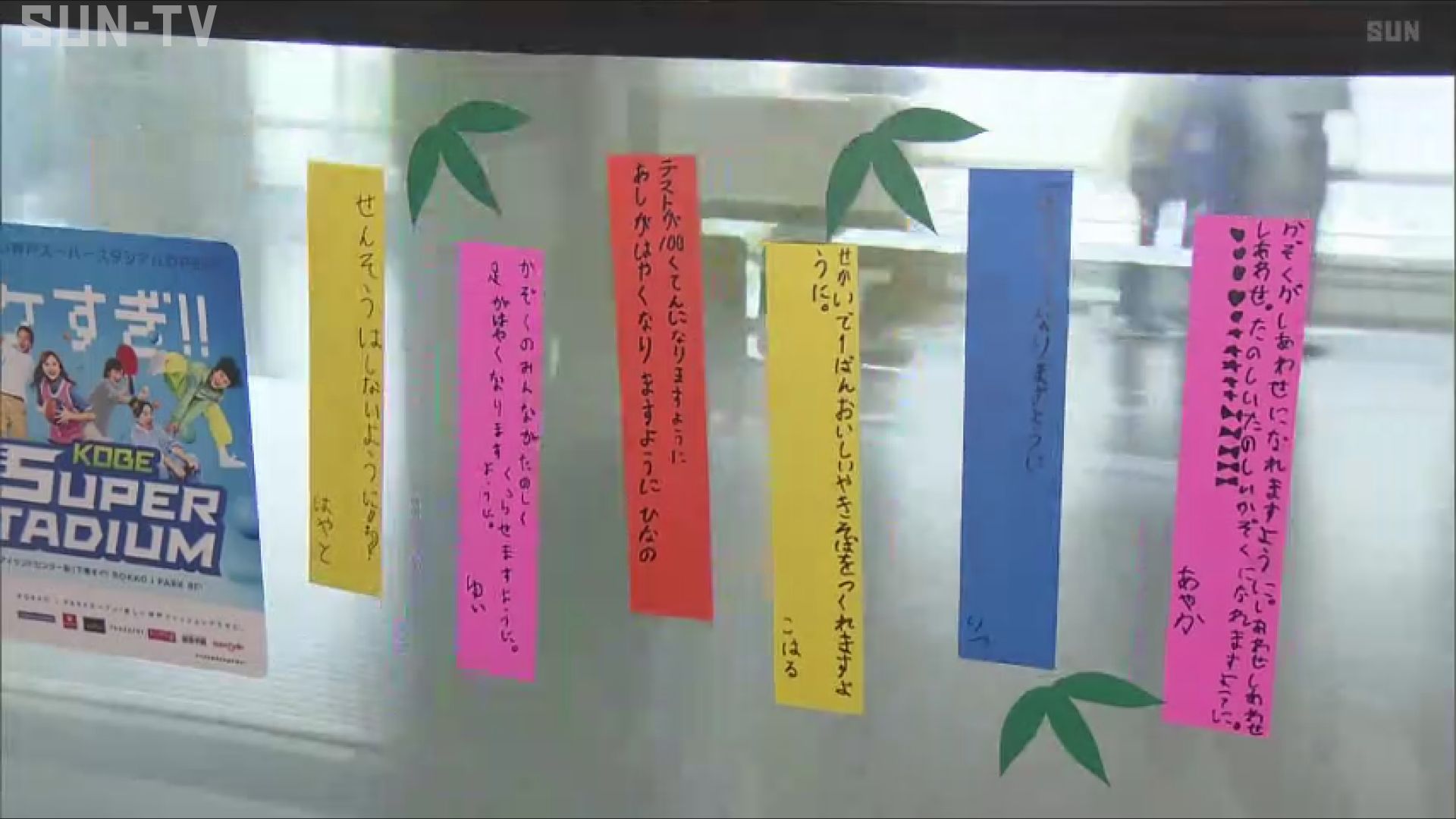 車両内の窓ガラスには、六甲アイランドにある3つの小学校の2年生の児童211人の願いごとが書かれた短冊が飾られています。