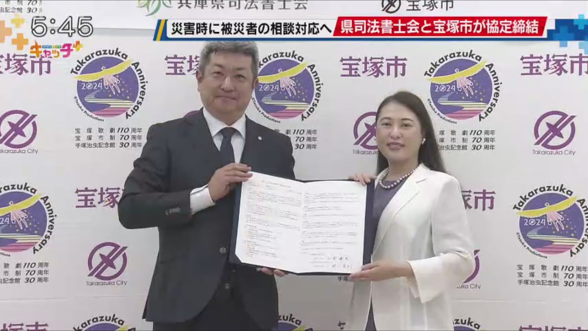 協定によると、災害発生時、県司法書士会は市からの要請で司法書士を派遣し、被災者からの相談を無料で受ける一方、宝塚市は相談会場の確保や関係機関との連絡調整などを行うということです。