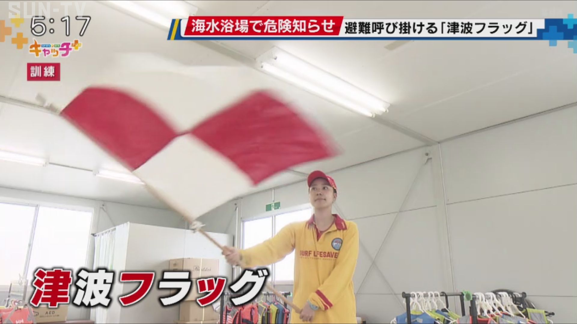 「津波フラッグ」は、大津波警報、津波警報、津波注意報が発表されると、ライフセーバーが危険の及ばない範囲で旗を掲げ、その後、避難誘導を行います。